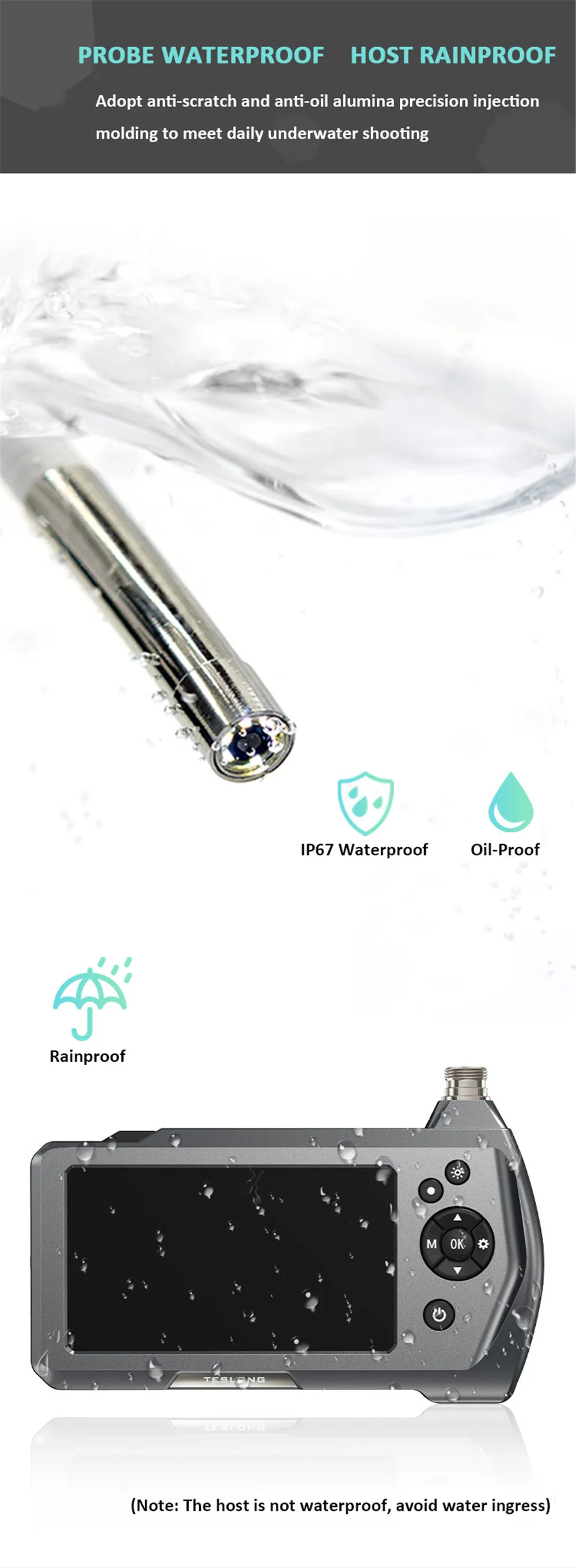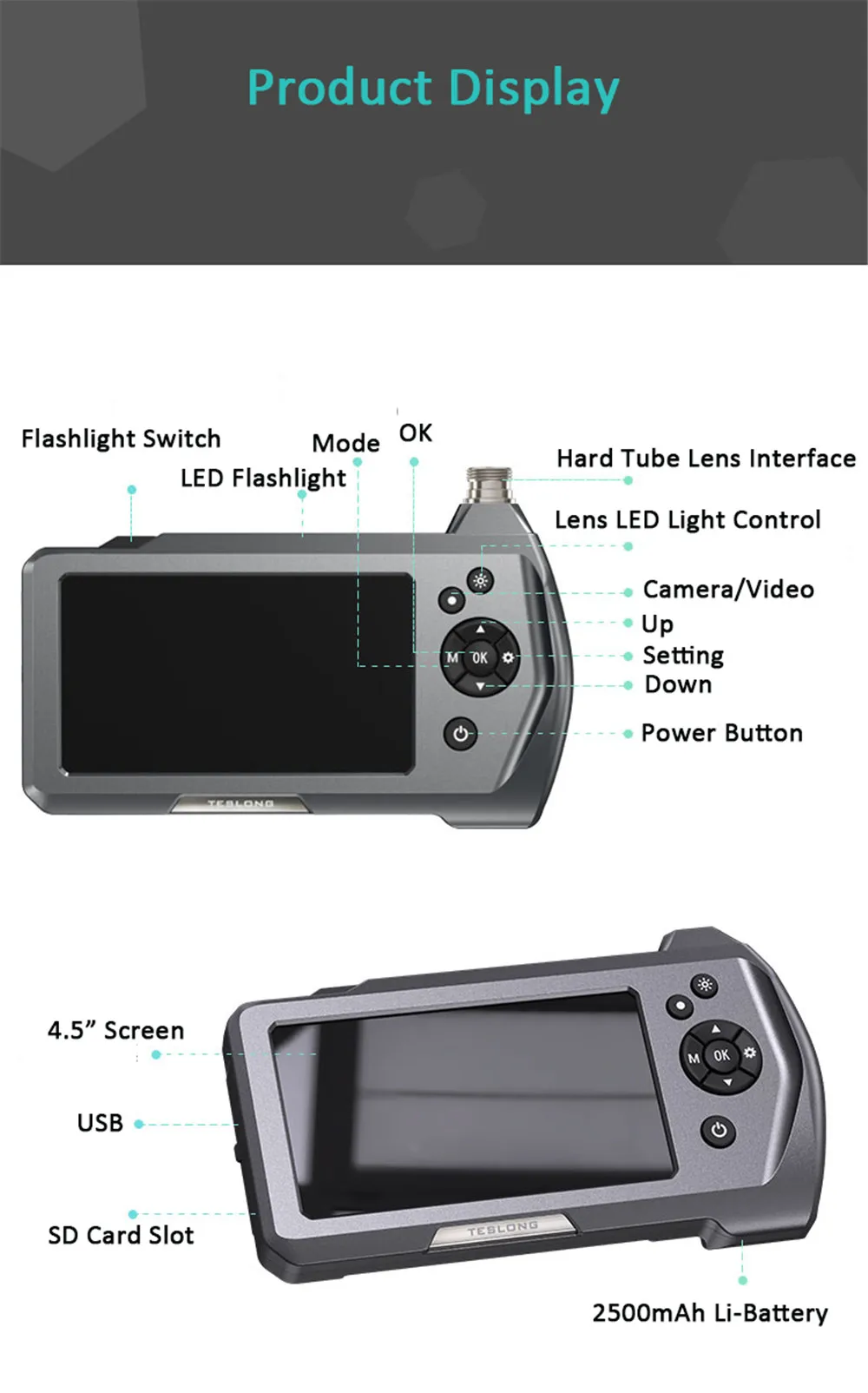 Главный параметр Модель: NTS450A Тип экрана: 4,5 дюймов Размер Цвет ЖК-дисплей монитор Разрешение экрана: 854*480 пикселей Вращение экрана: 180 ° Разрешение видео: 1280*720/1920*1080 пикселей (опционально) Разрешение камеры: 1920*1080 пикселей Основной корпус: непромокаемый Порт: USB интерфейс, слот для карты памяти TF LanguageChinese/английский/французский/испанский/немецкий/японский/португальский Параметры камеры Камера Диаметр: 3,9 мм/5,5 мм/7,6 мм Диаметр шланга: 3,6 мм/4,7 мм/6,2 мм Длина шланга: 1 м/2 м/3 м/5 м Пиксели: 1.0MP Угол обзора: 60 ° Уровень водонепроницаемости: IP67 Диапазон фокусировки: 30 мм-60 мм Аккумулятор: встроенный литий-ионный аккумулятор 2500 мАч Срок службы батареи: 5-6 часов Вспомогательное освещение: 6 светодиодный светильник с регулируемой яркостью + 1 Вт фонарик Рабочая температура: от 32 до 113 °F (от 0 до 45 °C) Напряжение: 3,7 вольт