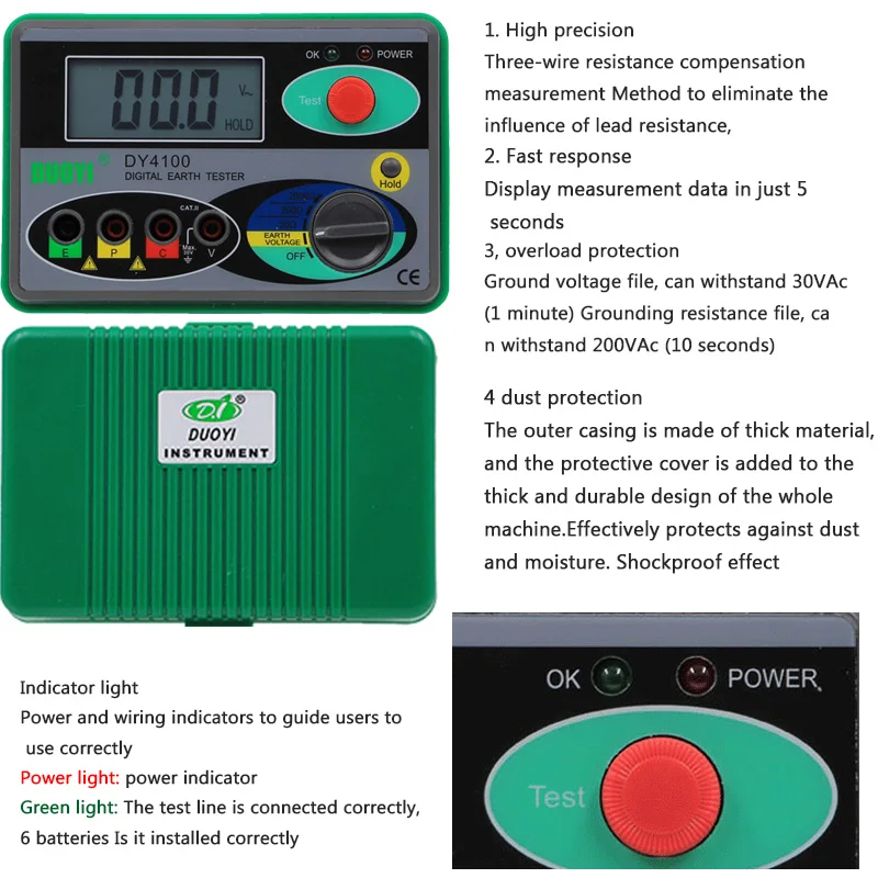1. Multifunction: Ideal for testing earth resistance of arious earth systems including power systems, electric equipment, lightning conductors and more.