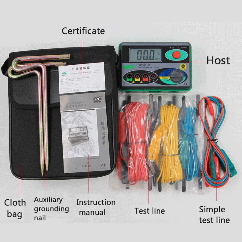 1*tester, 1*simple test lead, 1 pack test lead, 2*auxiliary earth bars, 1*user manual, 1*qualification certificate, 1*cloth bag