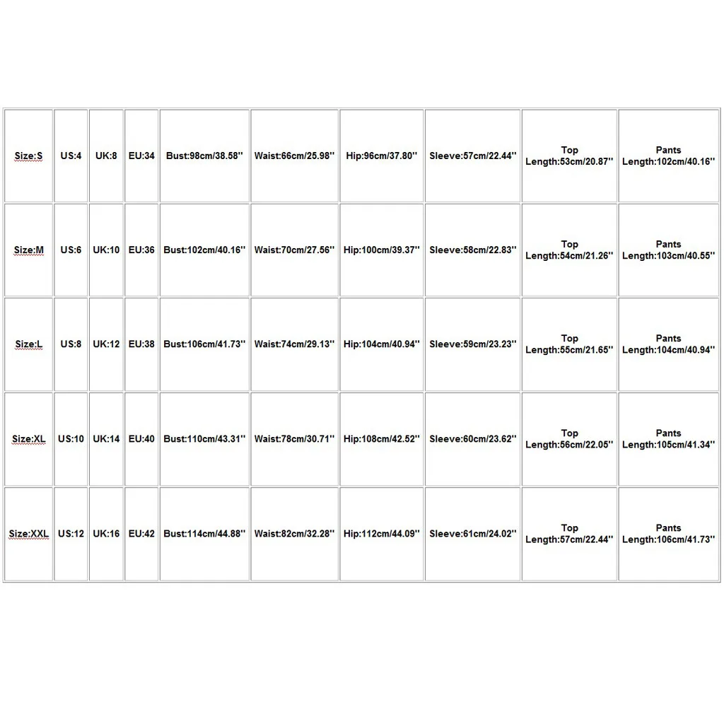 Размер Свяжитесь с нами Великобритания ЕС Обхват груди Обхват талии Обхват бедер Рукава Топ Длина Брюки Длина S 4 8 34 98 см/38,58'' 66 см/25,98'' 96 см/37,80'' 57 см/22,44'' 53 см/20,87'' 102 см/40,16'' М 6 10 36 102 см/40,16'' 70 см/27,56'' 100 см/39,37'' 58 см/22,83'' 54 см/21,26'' 103 см/40,55'' L 8 12 38 106 см/41,73'' 74 см/29,13'' 104 см/40,94'' 59 см/23,23'' 55 см/21,65'' 104 см/40,94'' XL 10 14 40 110 см/43,31'' 78 см/30,71'' 108 см/42,52'' 60 см/23,62'' 56 см/22,05'' 105 см/41,34'' XXL 12 16 42 114 см/44,88'' 82 см/32,28'' 112 см/44,09'' 61 см/24,02'' 57 см/22,44'' 106 см/41,73''
