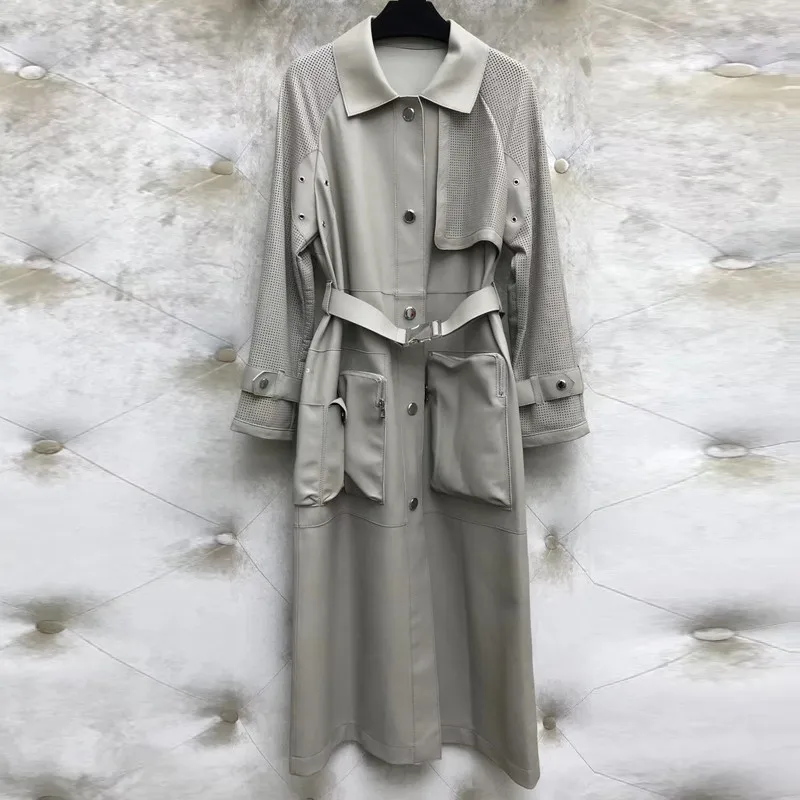 Тренч из натуральной кожи, женское модное пальто из овчины с поясом, новый длинный Тренч с карманами