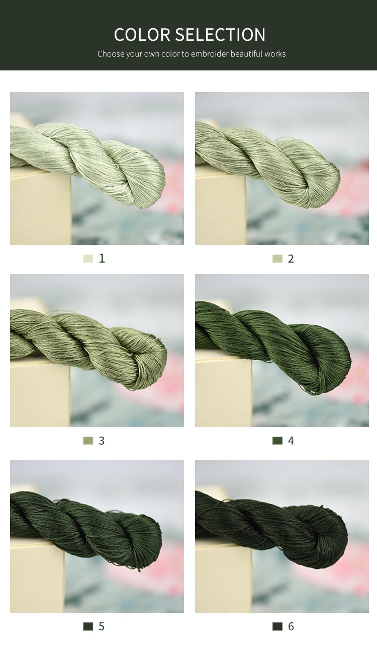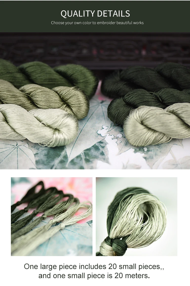 400 м чистый цвет вышивки Нитки/поделки, ручная вышивка/аксессуары ручной работы/сухой зеленый серии Особенности: 1.100% шелк и высокое качество, подходит для Сучжоу ручной вышивки. 2. Длина: 400 метров (20 метров/маленький кусок) 3. У вас есть шесть цветов на выбор 4. Пожалуйста, обратите внимание, что в зависимости от дисплея, продукт может производить некоторые различия в цвете, пожалуйста, знать и понять эту ситуацию. В комплект входит: 1 шт. (включая 20 маленьких штук)
