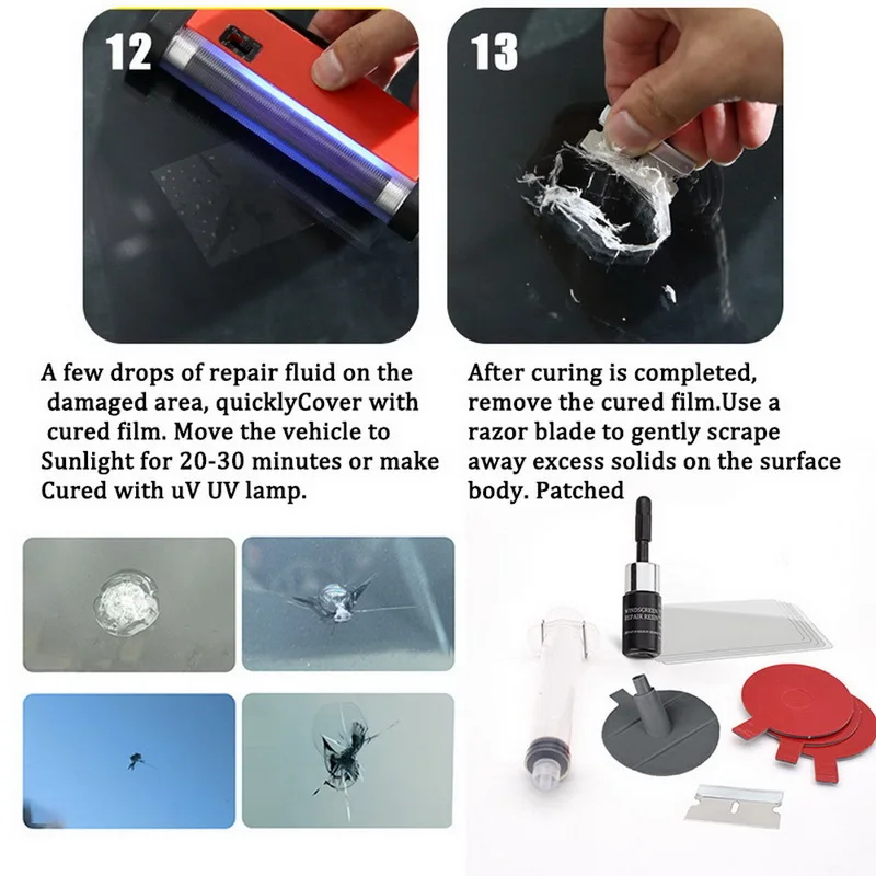 Набор 2: 1 * ремонтный раствор, 1 * шприц, 3 * клейкая прокладка, 1 * набор отверждаемой пленки, 1 * лезвие, 1 * подставка