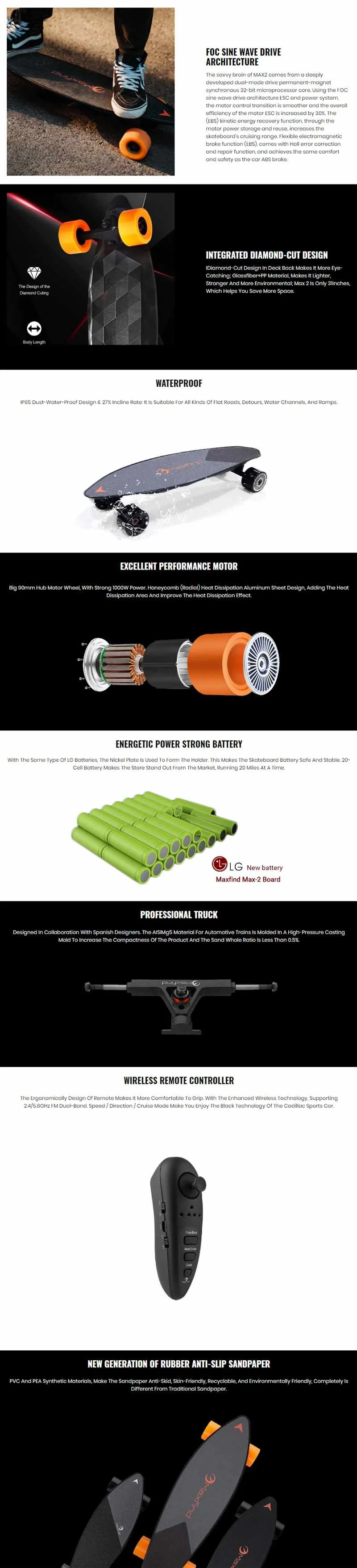 1. FOC синусоидальный привод архитектура 3. Отличная производительность двигателя 5. Мощный аккумулятор 6. Профессиональный Грузовик 7. Беспроводной пульт дистанционного управления 8. Новое поколение резиновой противоскользящей наждачной бумаги Посылка включает в себя: 1 * Новый электрический скейтборд Max2 1 * пульт дистанционного управления Bluetooth 1 * супер быстрое зарядное устройство UL 1 * T Скейт инструмент 1 * зарядное устройство с дистанционным управлением 1 * ремешок с пультом дистанционного управления 1 * зарядный кабель 1 * Руководство пользователя