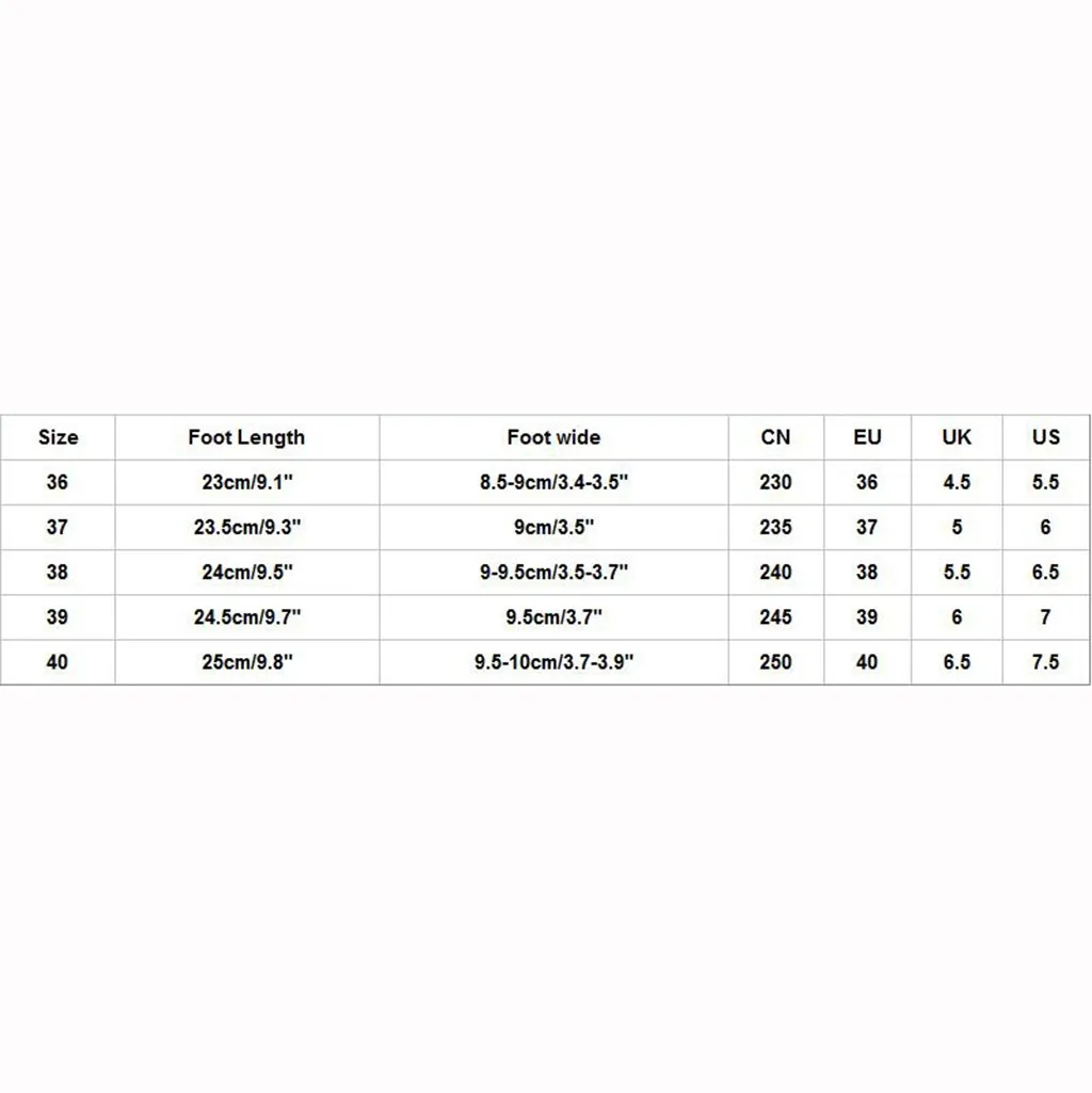 Размеры Foot Длина При покупке обувь на широкую ногу CN ЕС Великобритания Свяжитесь с нами 36 23 см/9,1" 8,5-9 см/3,4-3,5" 230 36 4,5 5,5 37 23,5 см/9,3" 9 см/3,5" 235 37 5 6 38 24 см/9,5" 9-9,5 см/3,5-3,7" 240 38 5,5 6,5 39 24,5 см/9,7" 9,5 см/3,7" 245 39 6 7 40 25 см/9,8" 9,5-; Высотка каблука 10 см/3,7-3,9" 250 40 6,5 7,5