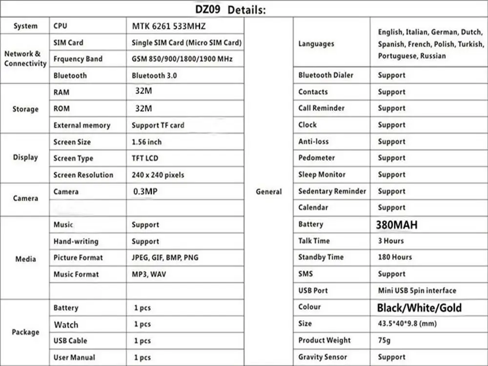 Частота: GSM 850/900/1800/1900 МГц Сеть и подключение: только сеть 2g ПЗУ: 32 м, ОЗУ: 32 м SIM-карта: одна SIM-карта (Micro SIM-карта) может быть в качестве телефона Bluetooth: Bluetooth 3,0 Внешняя память: Поддержка tf-карты до 32 Гб(ПамятьПосылка не входит в комплект) Камера: 0,3 м Музыка: Поддержка Формат изображения: JPEG, GIF, BMP, pps Формат музыки: MP3, WAV Функции: Bluetooth устройство для набора номера, контакты, напоминание о вызове, часы, защита от потери, шагомер, монитор сна, напоминание о малоподвижности, календарь Аккумулятор: 220 мАч Usb-порт: мини-USB 5pin интерфейс Датчик Гравитации: ПоддержкаЯзык: Английский, русский, испанский, польский, турецкий, итальянский, французский, немецкий.