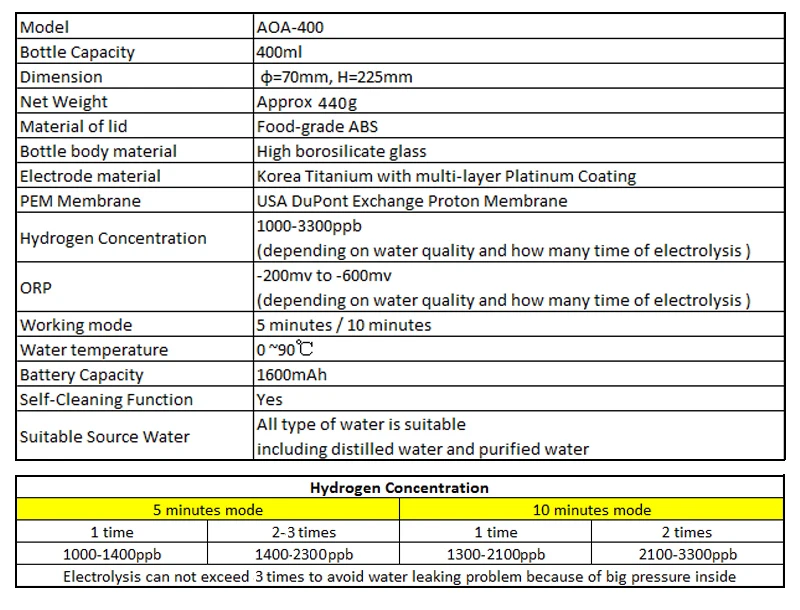 С помощью Du Pont N324 протонная мембрана для обмена и новейшие технологии SPE, AOA-400 может производить растворенный водород 1000ppb - 3300 ppb и ORP -200mv до-600mv в воде это количество водорода будет способствовать большему решению проблем болезни и созданию более здоровой жизни. Свободные радикалы вызывают множество здоровых проблем: В организме свободные радикалы вызывают аналогичное ухудшение, так как они разрушают клеточные мембраны и делают клетки уязвимыми для распада и патогенов. Эти свободные радикалы повреждают DNA и митохондрии, Основные строительные блоки всех тканей и оставляют на своем пути множество проблем со здоровьем. Водород удаляет свободные радикалы: Растворенные молекулы водорода ищут самые вредные свободные радикалы в наших телах и нейтрализует их, прежде чем они могут сделать больше повреждений наших клеток. H2 дарит электрон и связи со свободным радикалом для создания молекулы, в которой наши тела нуждаются в H20 или воде. Преимущества для питья водорода богатой водой: Согласно 500 научным исследованиям с 2007 года, было обнаружено, что молекулярный водород имеет большой терапевтический потенциал для лечения более 150 заболеваний. Попав в наш организм, он мгновенно начинает восстанавливать ткани и органы на клеточном уровне. Основные преимущества для здоровья: • Удалите вредные свободные радикалы из вашего организма • Улучшение здоровья и защиты клеток • Улучшает поглощение питательных веществ в организме • Лучшее увлажнение для вашего тела • Увеличение кровообращения • Помогает снизить уровень насыщенного жира • Уменьшает старение, чтобы придать коже здоровый вид • Улучшает функции мышечной ткани и подвижность суставов • Уменьшение проблем с запорами • Помогает снизить уровень холестерина • Детоксифицирует ваше тело • Быстрое восстановление после физической тренировки • Улучшает качество жизни больных раком, проходящих медицинское лечение. AOA-400 имеет следующие преимущества продукта: 1: эстетический дизайн, красивый 2. Du Pont PEM мембрана с новейшей технологией SPE 3. Пластины электролиза изготовлены из титана с многослойным платиновым покрытием. 4. Высокое боросиликатное стекло. 5. Два режима работы, 5 минут и 10 минут 6: Режим самоочистки (также называется режимом озона), вода используется для очистки овощей для удаления пестицидов или дезинфекции. (вода из этого режима не может быть выпита) 7. Конструкция выхлопных газов, отсутствие озона, кислорода и перекиси водорода 8. Водород макс до 3300 ppb и ORP макс до-600мв (в зависимости от качества воды и сколько раз электролиза) 9. Используйте эксклюзивную технологию растворения водорода, удерживайте водород в воде 10. Нет ограничений по источнику воды, можно использовать даже дистиллированную воду и очищенную воду. 11. Оснащен простым набором для ингаляции водорода, легко вдыхать водород в любое время и в любом месте