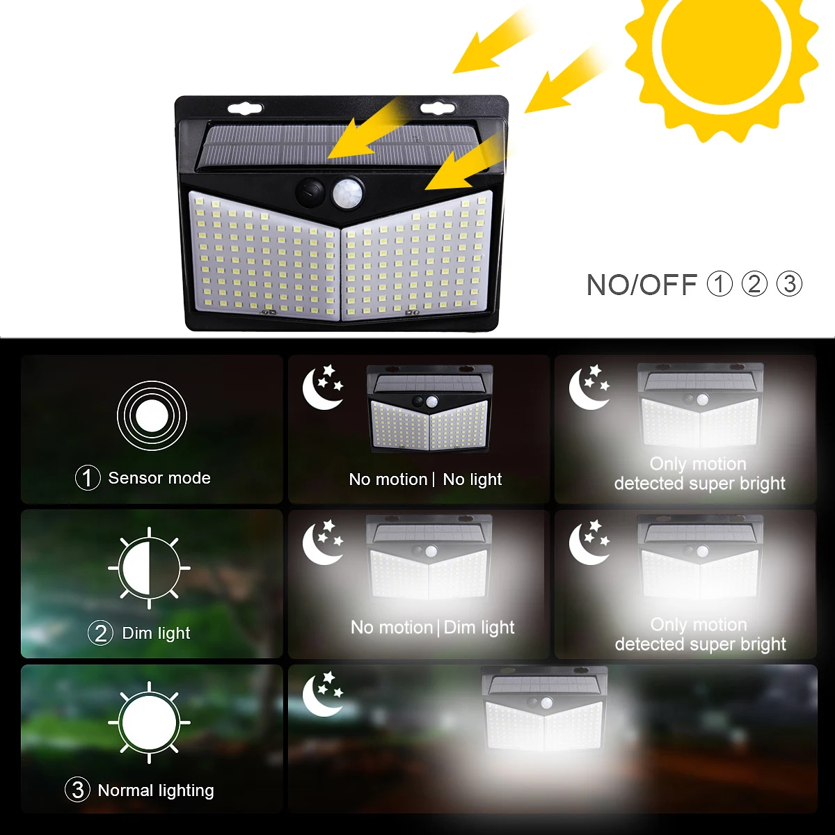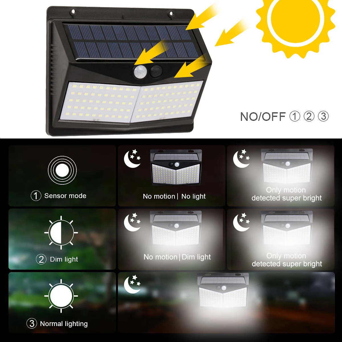 3 режима интеллектуального освещения: Модернизированный солнечный светильник s на открытом воздухе имеет три режима для удовлетворения ваших различных потребностей: режим тусклый длинный светильник, сильный режим датчика, режим датчика движения. Чувствительность к движению до 10-16 футов и угол датчика 120 °, обеспечивая удобство и безопасность для вашей повседневной жизни.