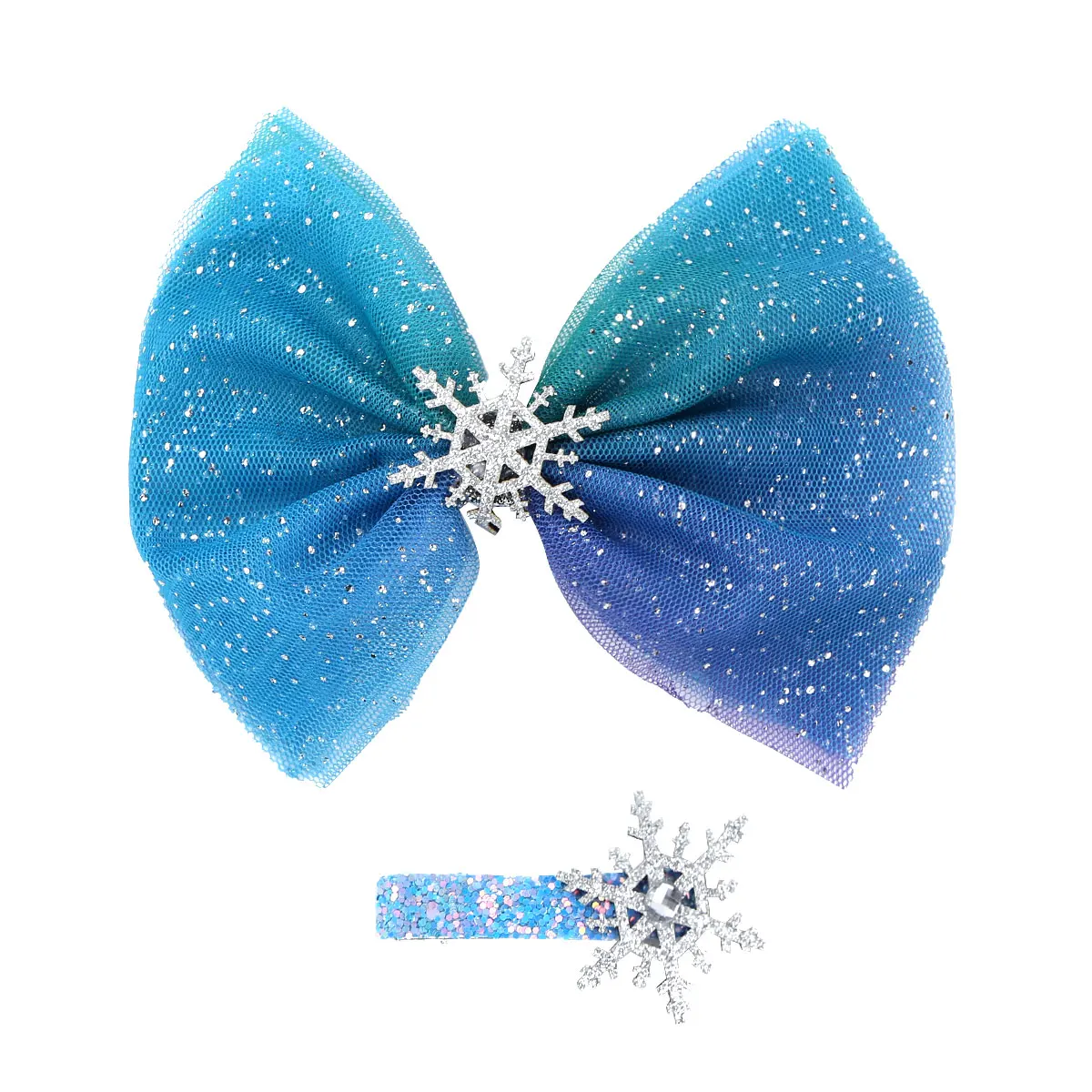 Многослойная Звездная сетчатая заколка с бантом и украшением в виде снежинки посередине.