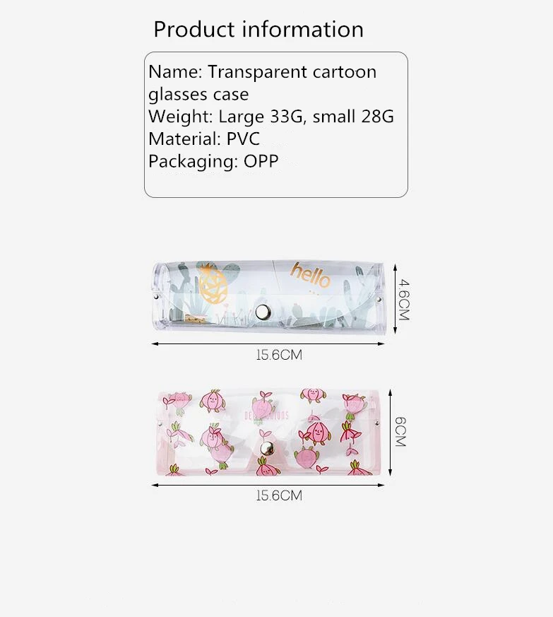 Название: прозрачный Чехол для очков с героями мультфильмов Вес: большой 33 г, маленький 28 г Материал: ПВХ Упаковка: пенополиуретан с открытыми порами