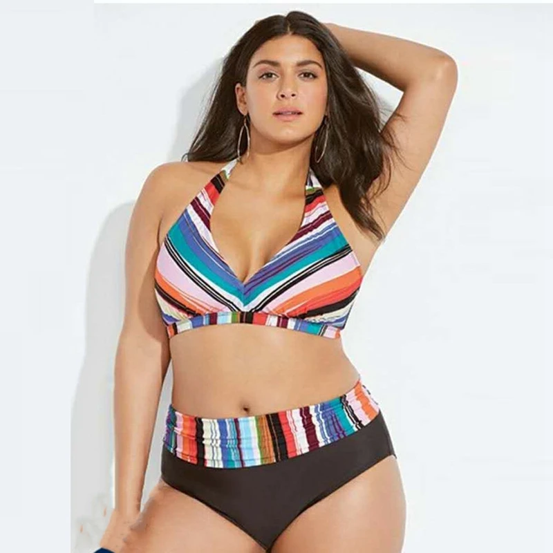 Сексуальный купальник бикини с лямкой на шее для женщин, купальник размера плюс, танкини в полоску, пуш-ап, бюстгальтер с подкладкой, купальный костюм из двух предметов, пляжная одежда, Новинка