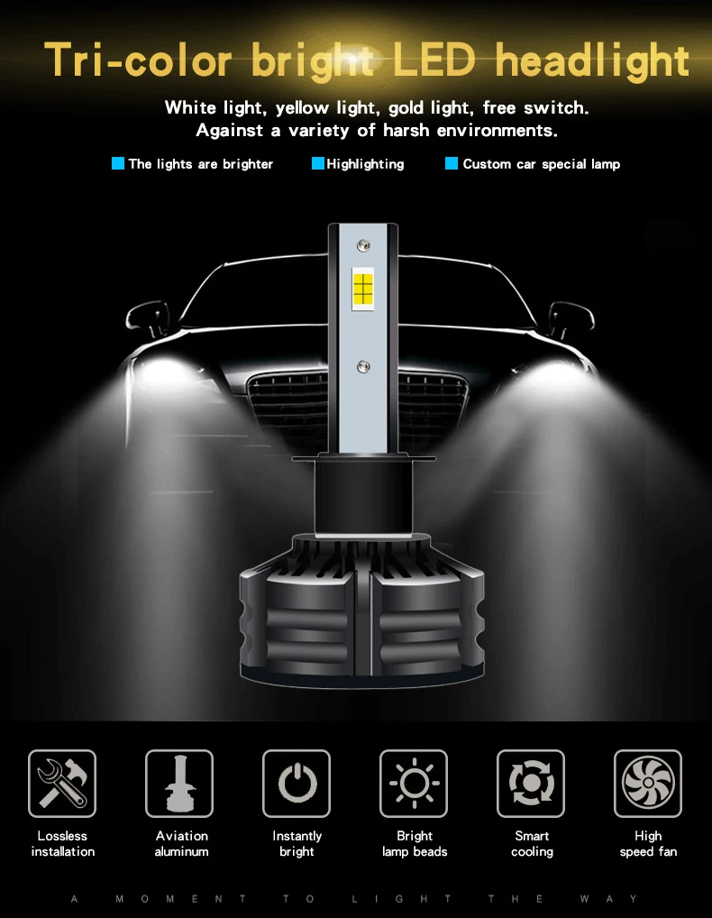 Параметры продукта: Мощность: 100W Световой поток: 20000LM Шарики лампы: 3570 изготовленный на заказ улучшенный вариант шариков Лампы Упаковка: нейтральная упаковка Вес: 450 г Температура: от-40 градусов до + 80 градусов Продолжительность жизни: ≥ 50000 часов Функция Описание: В светильник в режиме промежуток времени выключения светильник и включить опять же 0,3-6 секунд. Первый раз: включенный светильник-это одиночный белый светильник 6000K Переключатель 2-го времени: одиночный желтый Светильник 3000K Переключатель 3: желтый и белый микс 4300K Отличительные черты товара: Три цвета температуры подходят для любой погоды, солнечный белый светильник, дождь и туман, желтый светильник очень сильный, беспрепятственный, Усталость вождения может переключаться цвета, чтобы поднять дух, будет автомобиль, напоминание об изменении цвета пешеходов более заметное.