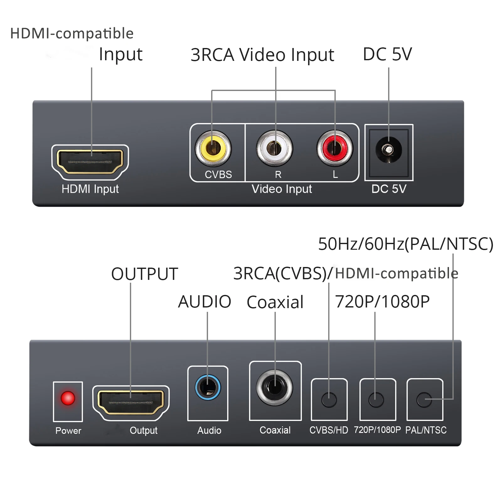 AV+HDMI-compatible TO HDMI-compatible convertercan convert 480I(NTSC)/576I(PAL) format signal to 720P/1080P HDMI-compatible signal output, also it can connect the high definition HDMI input interface, For easy connect the DVD, set-top box, HD player, Game Console (PS2,PS3,PSP,WII,XBOX360 etc).A new generation of digital processing chip, low-power, 24 hours of continuous work, no heat, work stability.