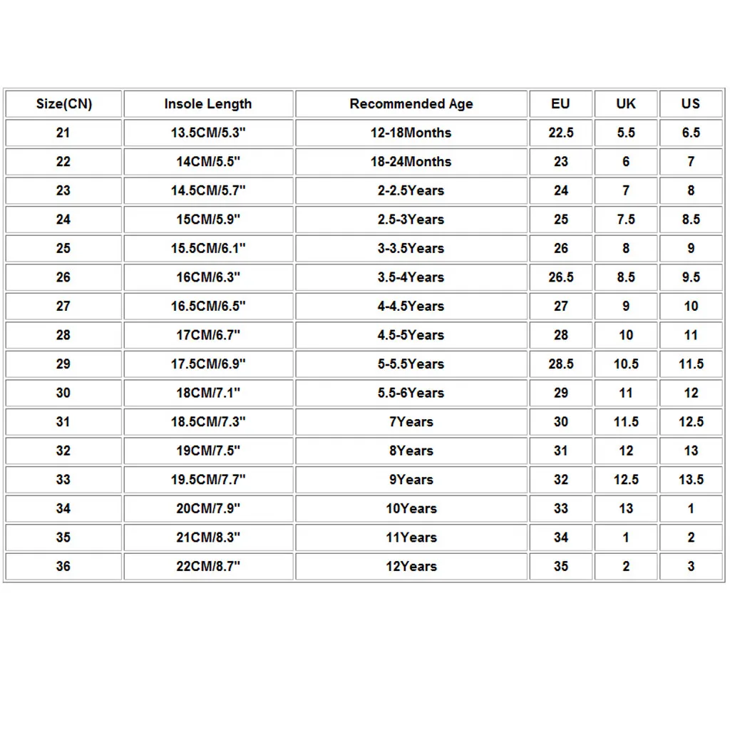 Размер (CN) Стельки Длина Рекомендуемый возраст ЕС Великобритания Свяжитесь с нами 21 13,5 см/5,3" 12-18Months 22,5 5,5 6,5 22 14 см/5,5" 18-24Months 23 6 7 23 14,5 см/5,7" 2-2.5Years 24 7 8 24 15 см/5,9" 2,5, для возраста до 3 лет 25 7,5 8,5 25 15,5 см/6,1" 3-3.5Years 26 8 9 26 16 см/6,3" 3,5-4 лет 26,5 8,5 9,5 27 16,5 см/6,5" 4-4.5Years 27 9 10 28 17 см/6,7" 4,5-5 лет 28 10 11 29 17,5 см/6,9" 5-5.5Years 28,5 10,5 11,5 30 18 см/7,1" 5,5-6 лет 29 11 12 31 18,5 см/7,3" 7 лет 30 11,5 12,5 32 19 см/7,5" 8 лет 31 12 13 33 19,5 см/7,7" 9 лет 32 12,5 13,5 34 20 см/7,9" 10 лет 33 13 1 35 21 см/8,3" 11 лет 34 1 2 36 22 см/8,7" 12 лет 35 2 3