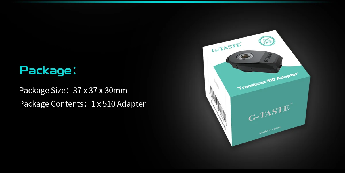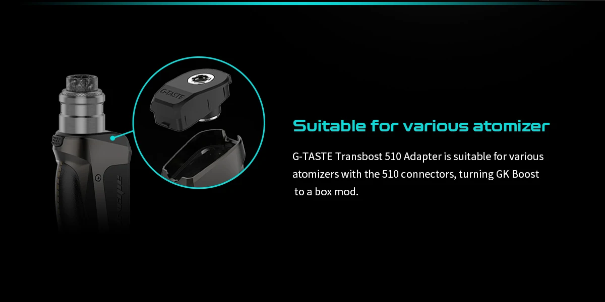 Адаптер G-TASTE Transbost 510 предназначен для системы GK Boost pod. С адаптером G Taste Transbost 510 GK Boost больше не просто устройство pod, но и бокс-мод. Vapers может заменить Boost pod с их любимыми резервуарами 510 коннектора, и наслаждаться различными испытаниями vaping. Более того, адаптер Transbost 510 очень прост в установке и удалении, и идеально подходит для разъема GK Boost, создавая тонкий мост между баком и устройством.