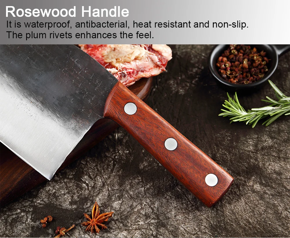 ПалисандрРучка:Ручка из твердой древесины, три стальных заклепок закреплены, не легко деформируется, не скользит. Чувствуйте себя комфортно. Передняя часть для нарезки и задняя часть для измельчения: передняя часть 3/4 используется для нарезки и измельчения, а задняя часть 1/4 используется для измельчения курицы и утки.