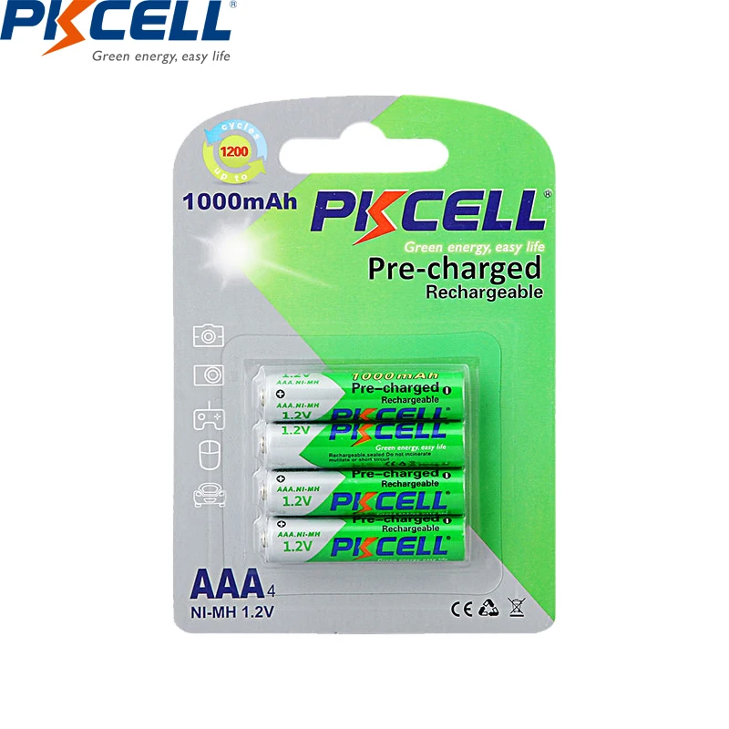 Тип батареи: 1,2 никель-металл-гидридный аккумулятор с напряжением AAA 1000mAh низкая степень самостоятельной разрядки Перезаряжаемые батарея Бренд: PKCELL Модель: ni-mh 1,2 V AAA 1000mAh низкий саморазряд Размер: AAA Напряжение: 1,2 V Нормальная ёмкость:1000 мА*ч Размер (макс.): Диаметр: 10,5 мм * Высота: 44,5 мм Стандартный ток заряда: 100 мА время: 15 ч Ток быстрой зарядки: 344ма время: 4 ч Применение:Цифровая камера, портативное видео, игра, фонарик, пульт дистанционного управления, игрушка, MP3/MP4 плеер, электрическая бритва и т.д.