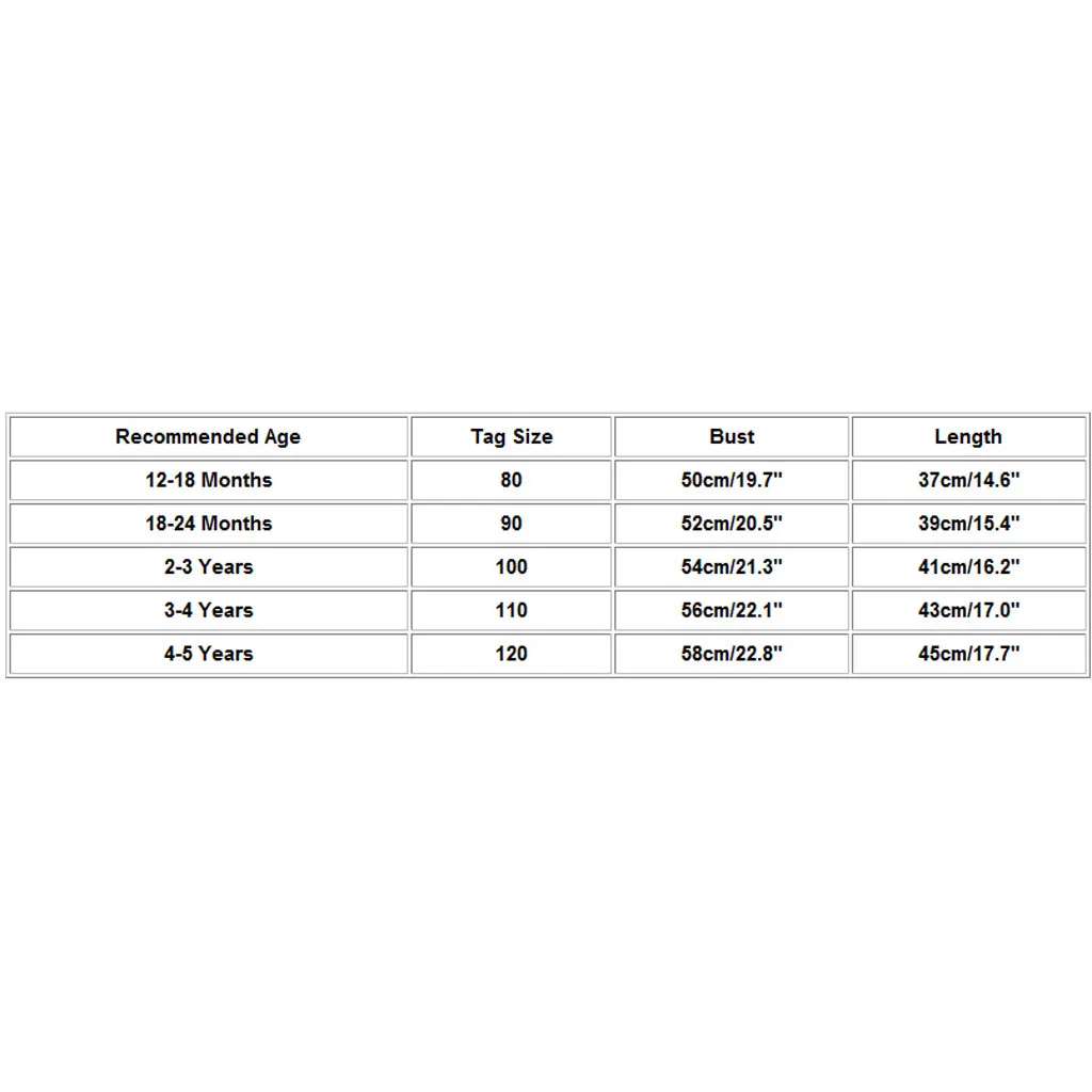 Рекомендуемый возрастРазмер биркиБюстДлина12-18 месяцев8050 см/19,7"37 см/14,6"18-24 месяцев9052 см/20,5 дюйма39 см/15,4 дюймаОт 2 до 3 лет10054 см/21,3"41 см/16,2"От 3 до 4 лет11056 см/22,1"43 см/17,0"От 4 до 5 лет12058 см/22,8"45 см/17,7"
