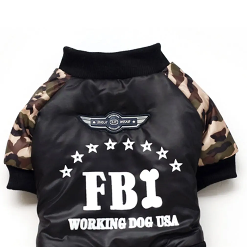 Зимнее теплое платье с четырьмя штанинами для собак, одежда для домашних животных, камуфляжный костюм с буквенным принтом FBI, комбинезон, хлопковое пальто, куртка