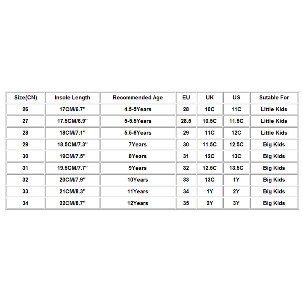 Размеры (CN) Стельки Длина Рекомендуемый возраст ЕС Великобритания Свяжитесь с нами Удобен для 26 17 см/6,7" 4,5-5 лет 28 10C 11C Дети дошкольного возраста 27 17,5 см/6,9" 5-5.5Years 28,5 10.5C 11.5C Дети дошкольного возраста 28 18 см/7,1" 5,5-6 лет 29 11C 12C Дети дошкольного возраста 29 18,5 см/7,3" 7 лет 30 11.5C 12.5C Дети младшего школьного возраста 30 19 см/7,5" 8 лет 31 12C 13C Дети младшего школьного возраста 31 19,5 см/7,7" 9 лет 32 12.5C 13.5C Дети младшего школьного возраста 32 20 см/7,9" 10 лет 33 13C 1Y Дети младшего школьного возраста 33 21 см/8,3" 11 лет 34 1Y 2Y Дети младшего школьного возраста 34 22 см/8,7" 12 лет 35 2Y 3Y Дети младшего школьного возраста