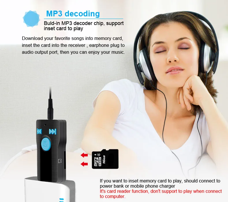 Этот продукт разработан в качестве usb-ключа для общения с Bluetooth, имеет высокую производительность И Профессиональный модуль Bluetooth, встроенный чип MP3 декодера, может воспроизвести музыку на Micro SD-карте Через аудио выход к автомагнитоле. Сотовый телефон с Bluetooth может автоматически переключаться на Функция бесконтактного общения при звонке входит в комплект, и возврат музыки при прослушивании звонков. Этот продукт более широко используется и совместим с различными USB-портами.
