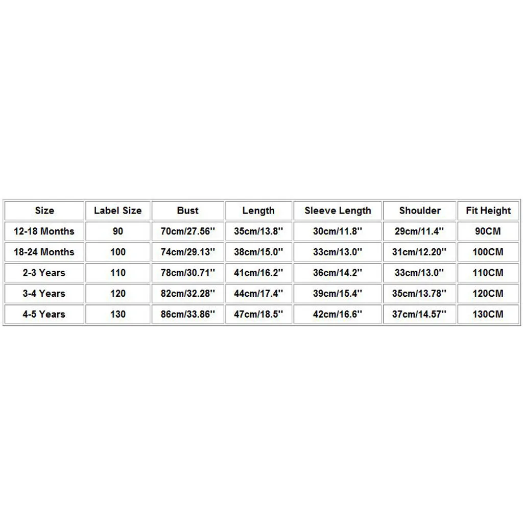 Размер Размер этикетки Бюст Длина Длина рукава Плечо Подходящая высота 12-18 месяцев 90 70 см/27,56'' 35 см/13,8'' 30 см/11,8'' 29 см/11,4'' 90 см 18-24 месяцев 100 74 см/29,13'' 38 см/15,0'' 33 см/13,0'' 31 см/12,20'' 100 см От 2 до 3 лет 110 78 см/30,71'' 41 см/16,2'' 36 см/14,2'' 33 см/13,0'' 110 см От 3 до 4 лет 120 82 см/32,28'' 44 см/17,4'' 39 см/15,4'' 35 см/13,78'' 120 см От 4 до 5 лет 130 86 см/33,86'' 47 см/18,5'' 42 см/16,6'' 37 см/14,57'' 130 см