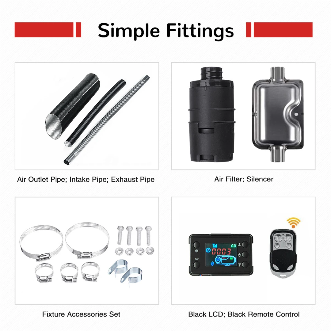 1 х парковочный обогреватель (ЖК-термостат) 1 х красный пульт дистанционного управления (батарейки в комплект не входят) 1 х воздушный выход 1 х Впускной патрубок 1 х выхлопная труба
