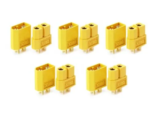 Изготовлен из высокотемпературного нейлона и позолоченные пружинные соединители, оба включены в литьевую форму в момент формирования соединителя. XT60 обеспечивает надежное соединение с высоким усилителем, идеально подходит для приложений до и за пределами 65A постоянной Особенности: 100% Новинка и высокое качество. 1 пара высококачественных XT60 штекерных и женских разъемов питания. Обеспечивает соединение с высоким усилителем. Используется в радиоуправляемых батареях и моторе. Посылка включает в себя: 5 пар XT60 Мужской Женский пулевые разъемы