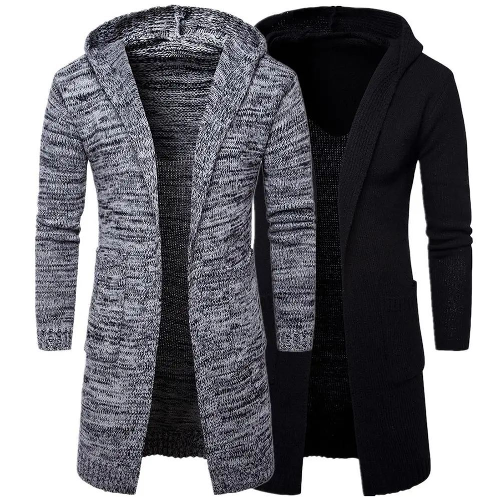 Повседневный мужской однотонный плотный вязаный кардиган с длинными рукавами и карманами, пальто с капюшоном