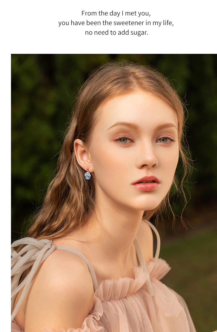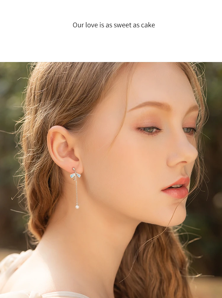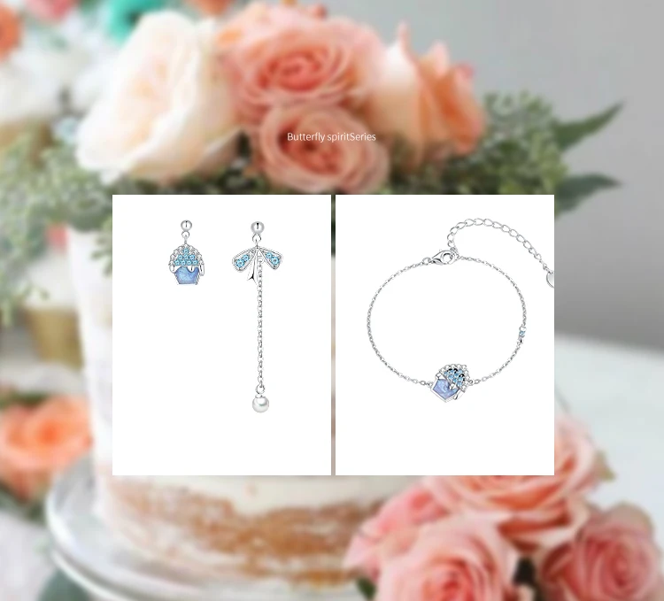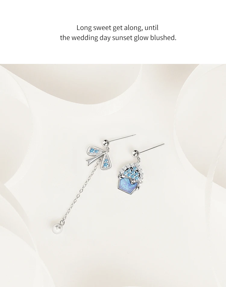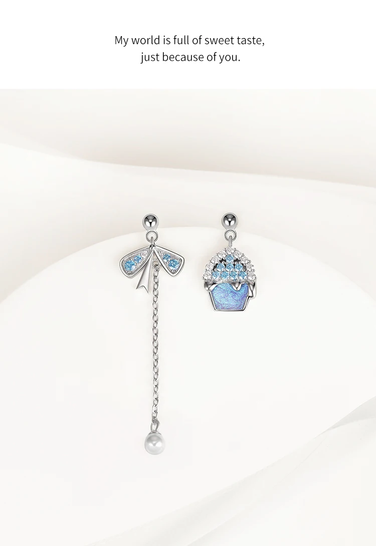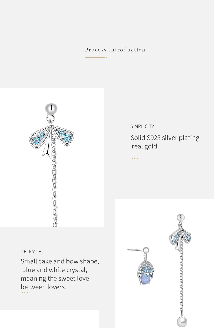 -Твердое Серебро S925 пробы с покрытием из настоящего золота. -Маленький торт и форма банта, синий и белый кристалл,-означает сладкую любовь между влюбленными. -Основа маленького торта сделана из холодной эмали, фантастического фиолетового цвета. Асимметричный дизайн; Бант с мелкими жемчужинами; Элегантный и элегантный.
