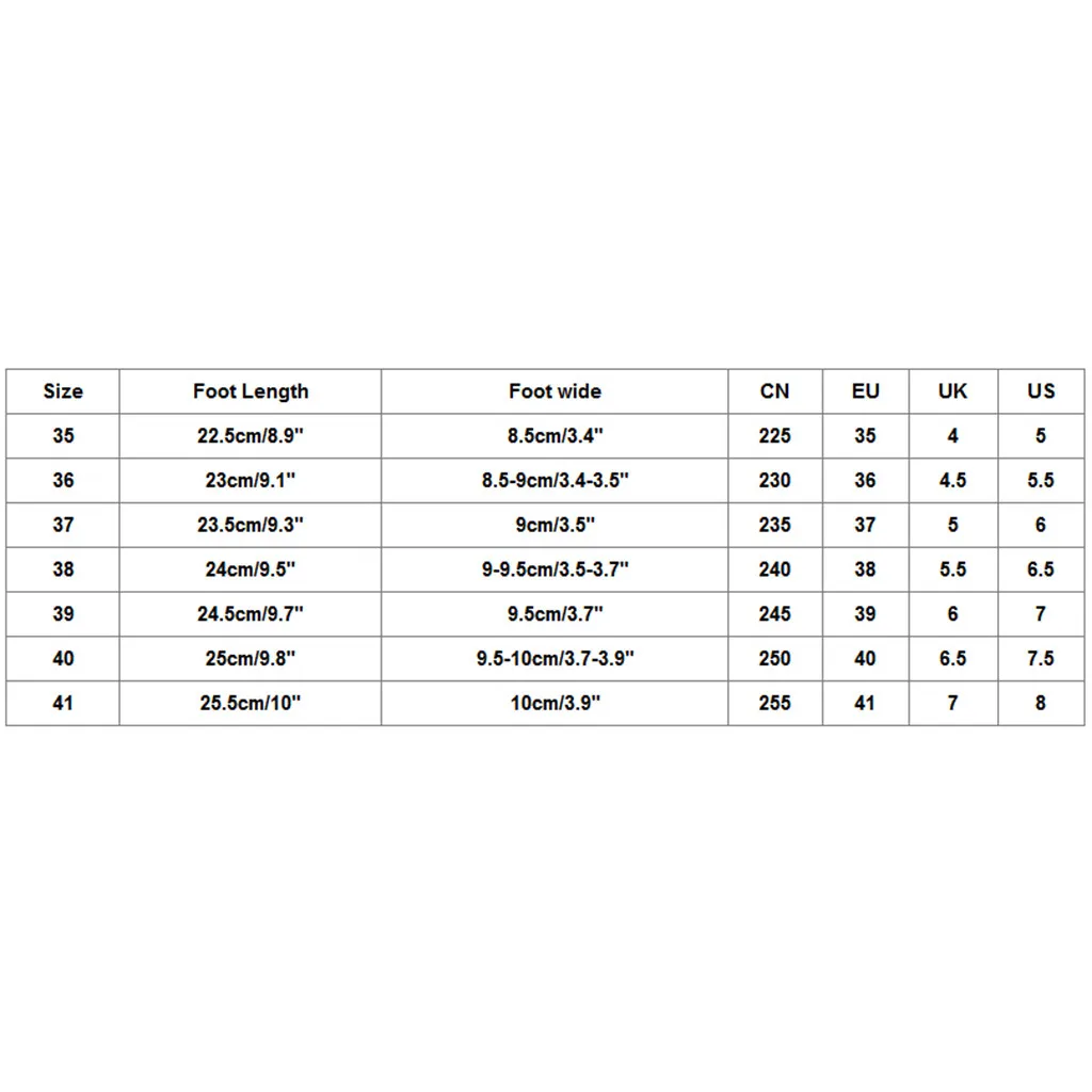 Размеры Foot Длина При покупке обувь на широкую ногу CN ЕС Великобритания Свяжитесь с нами 35 22,5 см/8,9" 8,5 см/3,4" 225 35 4 5 36 23 см/9,1" 8,5-9 см/3,4-3,5" 230 36 4,5 5,5 37 23,5 см/9,3" 9 см/3,5" 235 37 5 6 38 24 см/9,5" 9-9,5 см/3,5-3,7" 240 38 5,5 6,5 39 24,5 см/9,7" 9,5 см/3,7" 245 39 6 7 40 25 см/9,8" 9,5-; Высотка каблука 10 см/3,7-3,9" 250 40 6,5 7,5 41 25,5 см/10" Высота каблука 10 см/3,9" 255 41 7 8