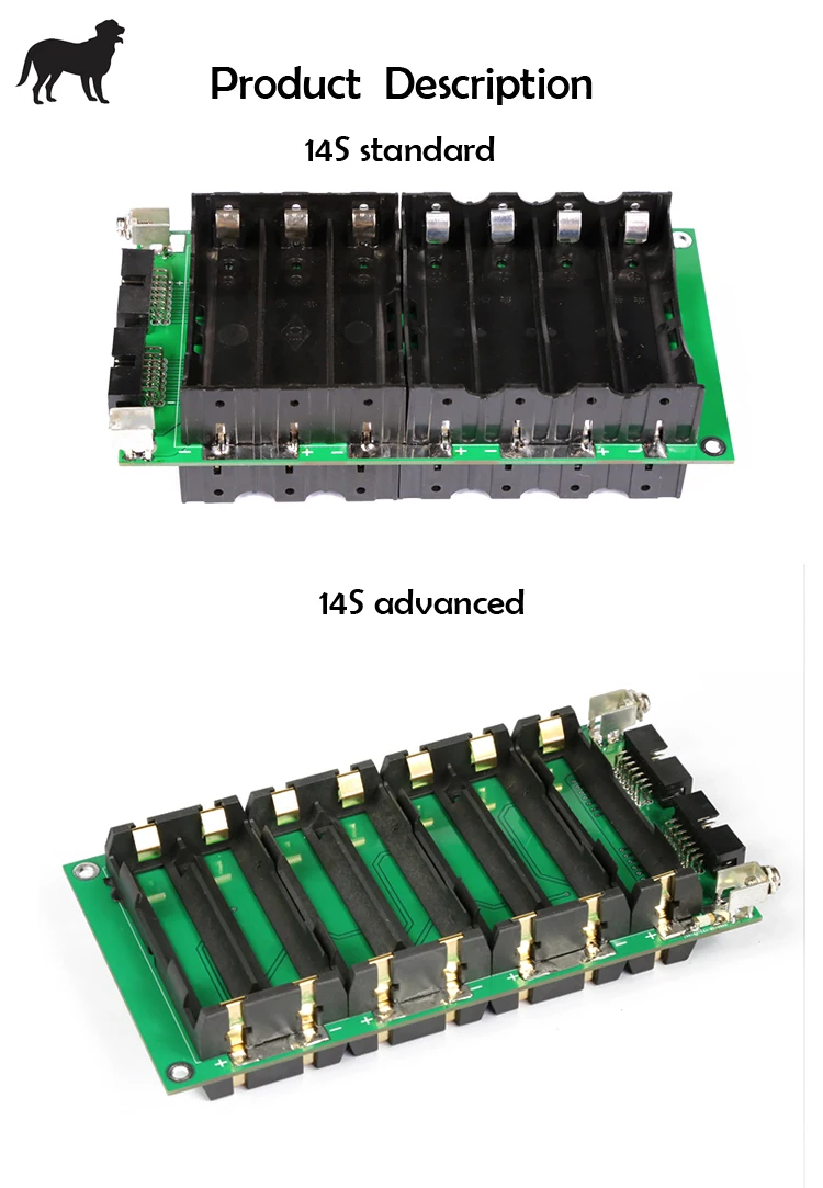 Параметры продукта 14S стандарт 14S advanced Вес: 178 г Вес: 170 г Размер: 172*90*45 мм Размер: 172*90*33 мм 14S 20A BMS 14S 45A BMS Вес: 122 г Вес: 124 г Размер: 175*90*17 мм Размер: 175*90*18 мм На что следует обратить внимание ★★★★Пожалуйста, купите по крайней мере один BMS. BMS может обеспечить функцию выравнивания заряда и разряда для всей системы (несколько аккумуляторных коробок) одновременно. ★Лучше разместить заказ вместе с BMS, чтобы избежать чрезмерной зарядки и чрезмерной разрядки и несбалансированного напряжения в процессе использования. ★Зарядный ток каждого слоя не рекомендуется превышать 2А, в противном случае аккумулятор может генерировать тепло (например, если есть только один слой, выберите зарядное устройство 2А, И если есть два слоя, выберите зарядное устройство 4a). ★Посмотрите на печатную плату с ориентацией батареи, и все батареи не могут быть ошеломлены в той же ориентации. ★Не подключайте источник питания с неправильным положительным и отрицательным, на печатной плате есть знаки, обратите внимание на наблюдение. ★Вариант одноконтурной платы, исключая батарею на фото. ★Прайс-лист-это цена платы или держателя батареи. ★Направление установки батареи зависит от отметки на панели cirucit, а не от отметки на пластиковой аккумуляторной коробке.