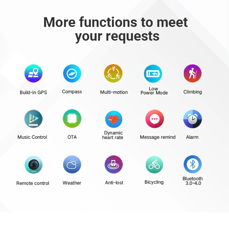 Функция: Компас, датчик давления, атмосферное давление, высота, геомагнитный, громкоговоритель, время/дата, сжигание калорий, автоматическая запись активности (ходьба, дистанционное управление, бег), встроенный трек для записи GPS (внутренний бег, бег на открытом воздухе, езда на велосипеде, скалолазание, марафон), дышащие тренировки, автоматический монитор сна, Напоминание о сообщениях Push / Social Media, будильник, энергосбережение, управление фотографией, Bluetooth, воспроизведение музыки/микрофон/динамик/Синхронизация с мобильный телефон