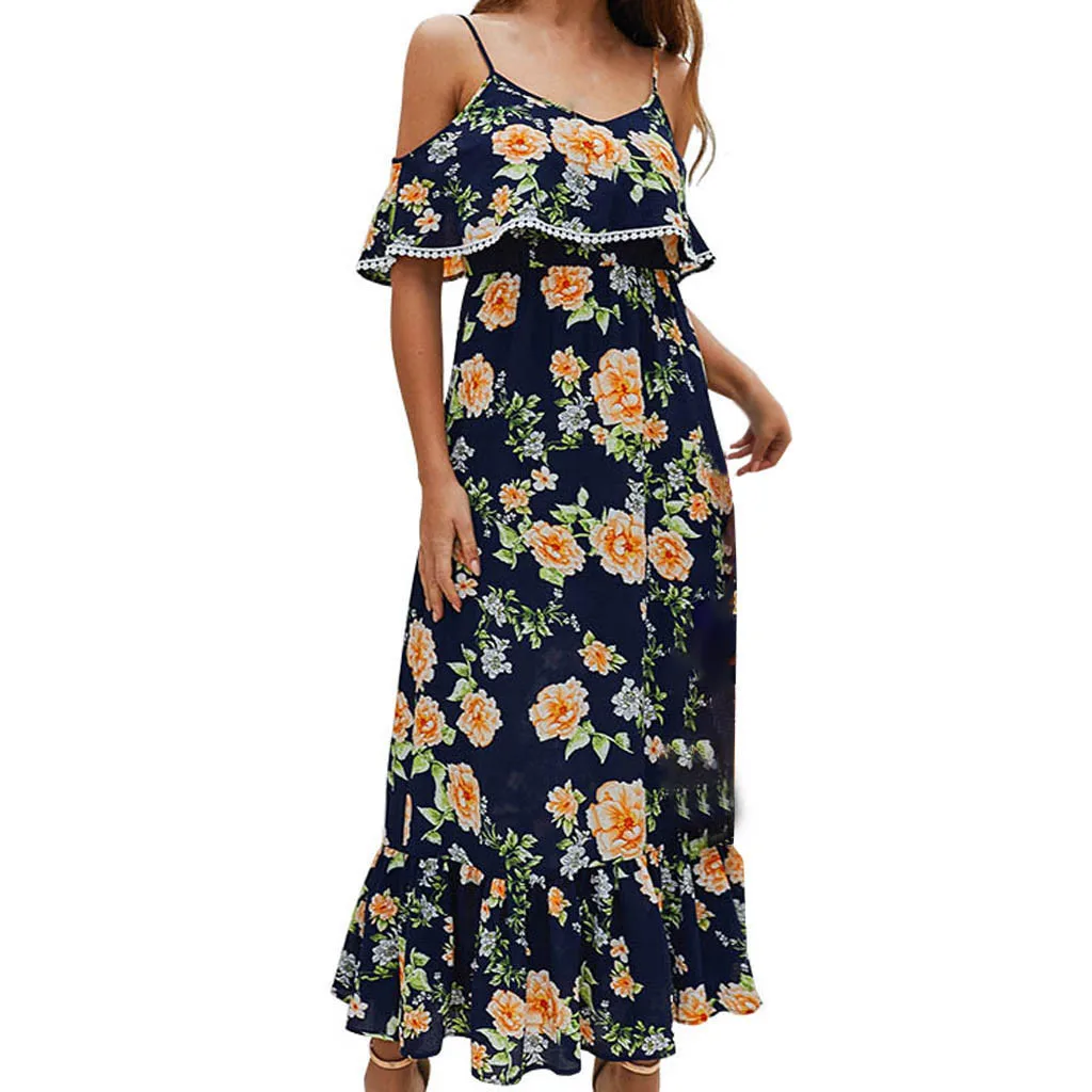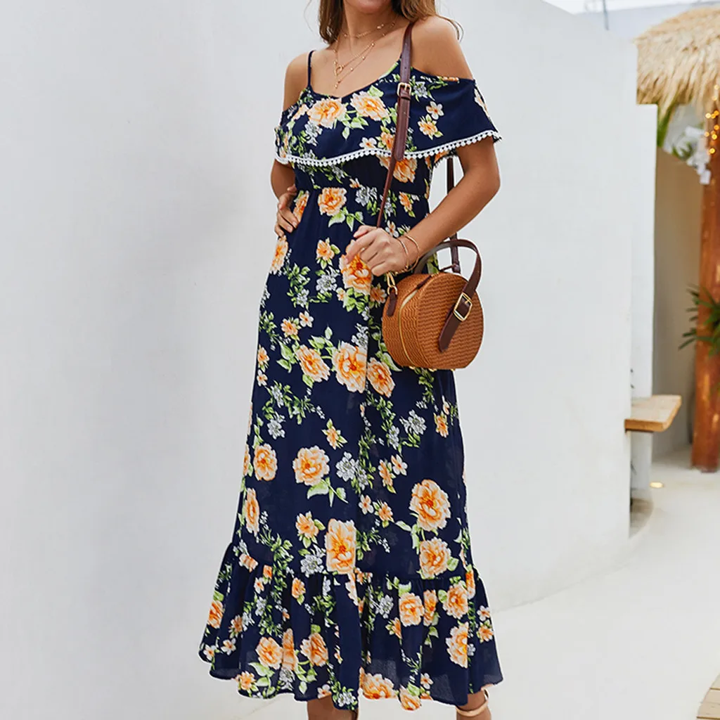Womens Fashion Camis Beach Dress Sexy Printed Cold Shoulder Long Dress