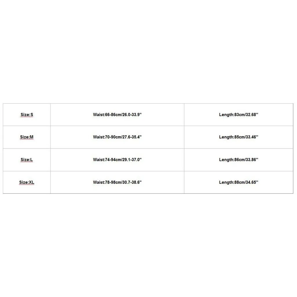 РазмерТалияДлинаS66-86 см/26,0-33,9"83 см/32,68''М70-90 см/27,6-35,4"85 см/33,46''L74-94 см/29,1-37,0"86 см/33,86''XL78-98 см/30,7-38,6"88 см/34,65''