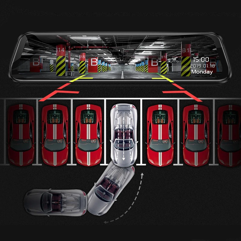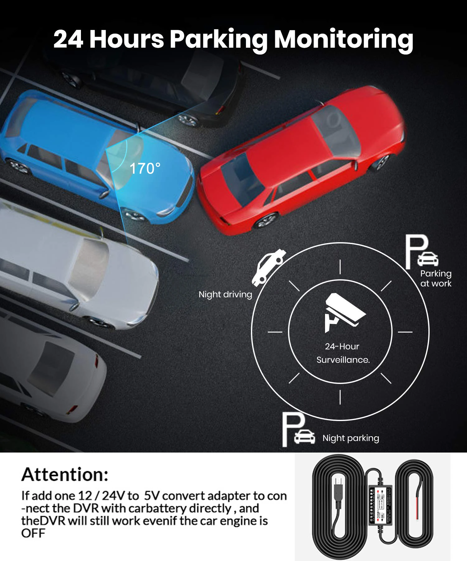 Зарядное устройство в прикуриватель для питания автомобильного видеорегистратора. Когда вы получите свой автомобиль в обратном направлении, Автомобильный видеорегистратор автоматически переключается на заднюю камеру с помощью линии парковки. Тогда функция автоматического заднего хода будет работать