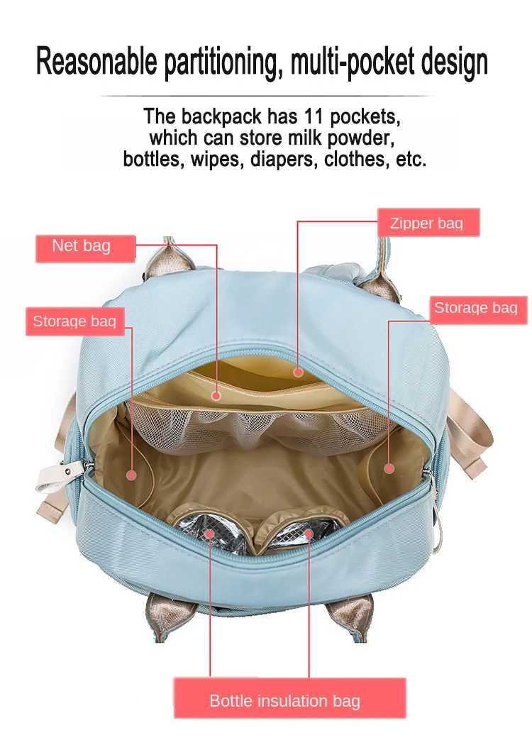 The backpack has 11 pockets, which can store milk powder, bottles, wipes, diapers, clothes, etc.