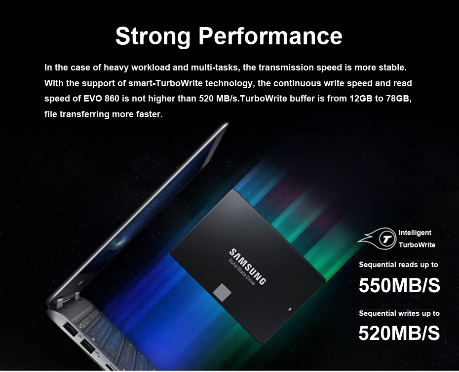 2.Производительность:Скорость непрерывной записи и скорость чтения EVO 860 не ниже 520 МБ/с./с. Буфер TurboWrite от 12 Гб до 78 ГБ.