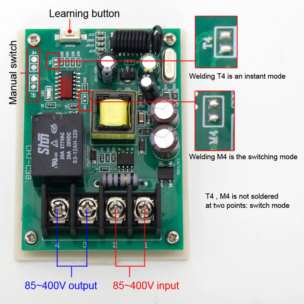 Батарея Модель: CR2032(Посылка не входит в комплектАккумулятор) Расстояние: в помещении (20 метров) на открытом воздухе (80 метров) Технические данные приемника: Входная мощность: 85 В-400 В переменного тока Ток в режиме ожидания: <5 мА Частота RF: 433 МГц Режим работы RF: супергетеродинный Чувствительность приема: >97dbm Расстояние передачи: 20-50 м(Открытое пространство) Режим декодирования: Программное обеспечение MCU декодирование Внешнее хранилище: 20 штук Поддержка удаленного типа: код обучения 1527 код Режим работы: Мгновенный, тумблер, фиксация Пульт дистанционного управления содержит батареи