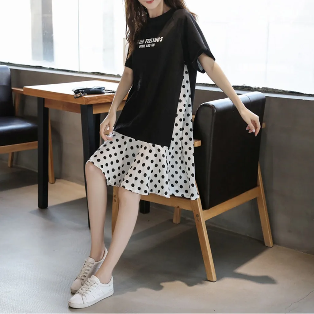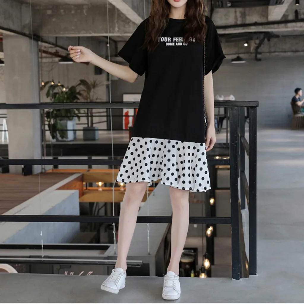 Женское модное платье в горошек с коротким рукавом и круглым вырезом