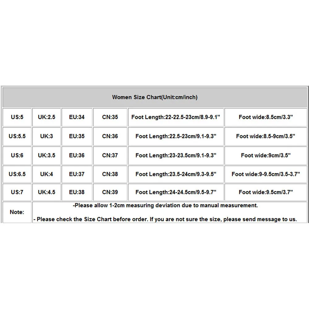 Для женщин Размеры Таблица (единица измерения: см/дюйм) Свяжитесь с нами: 5 Великобритания: 2,5 ЕС: 34 CN: 35 Массаж ног Длина: 22-22.5-23cm/8,9-9,1" Массаж ног Широкий: 8,5 см/3,3" Свяжитесь с нами: 5,5 Великобритания:3 ЕС: 35 CN: 36 Массаж ног Длина: 22,5-23 см/9,1-9,3" Массаж ног Широкий: 8,5-9 см/3,3-3,5" Свяжитесь с нами:6 Великобритания:3,5 ЕС: 36 CN: 37 Массаж ног Длина: 23-23,5 см/9,1-9,3" Массаж ног Широкий: 9 см/3,5" Свяжитесь с нами:6,5 UK: 4 ЕС: 37 CN: 38 Массаж ног Длина: 23,5-24 см/9,3-9,5" Массаж ног Широкий: 9-9,5 см/3,5-3,7" Свяжитесь с нами:7 Великобритания: 4,5 ЕС: 38 CN: 39 Массаж ног Длина: 24-24,5 см/9,5-9,7" Массаж ног Широкий: 9,5 см/3,7" Примечание: -Замеры сделаны вручную, поэтому возможны отклонения на 1-2 см.- Пожалуйста, проверьтеРазмеры диаграммыПрежде чем делать заказ. Если вы не уверены в размере, Пожалуйста, отправьте нам сообщение.