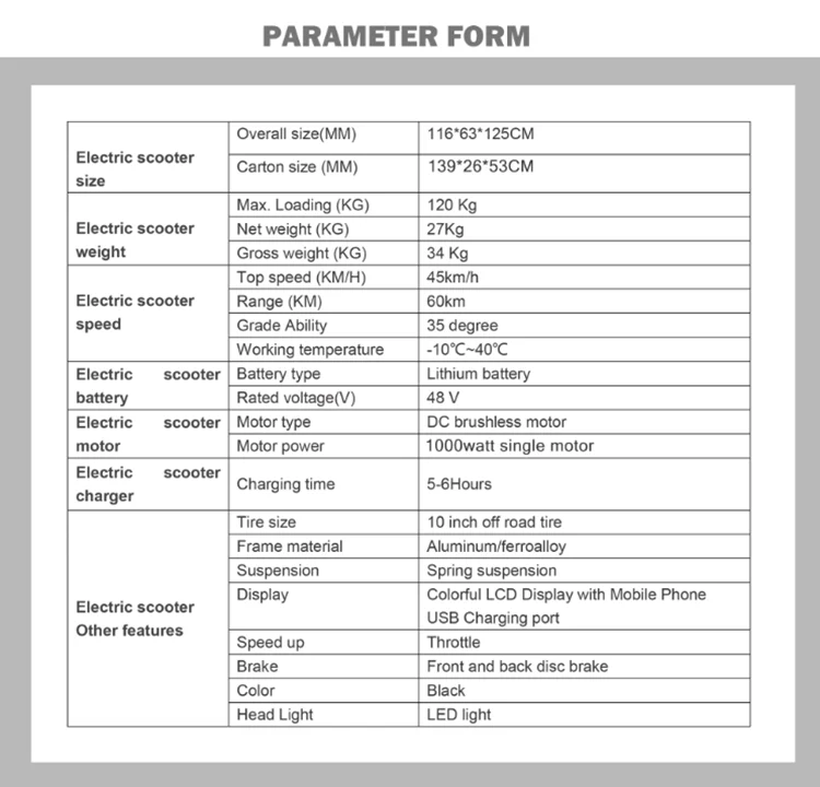 Номер модели: YMS12 Мощность двигателя: 1000 Вт, задний мотор Максимальная скорость: 45-55 км/ч Литиевая батарея: 48 в 21 Ач Диапазон: 50-60 км Шина: 0ff дорожная (10 дюймов) Тормоза: передние и задние дисковые тормоза Материал оправы: алюминий, сплав ferrolay Ключ: ключ напряжения Зарядное устройство: 48V2A