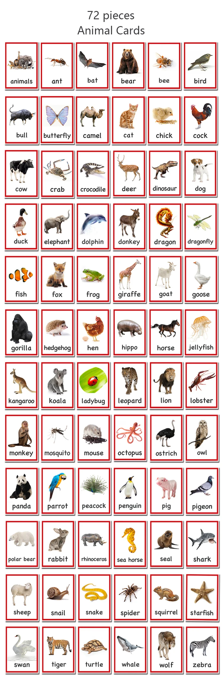 72 шт. английские флеш-карты с животными для детей, детские познавательные карточки с надписью, развивающие игрушки Монтессори, обучающие игрушки