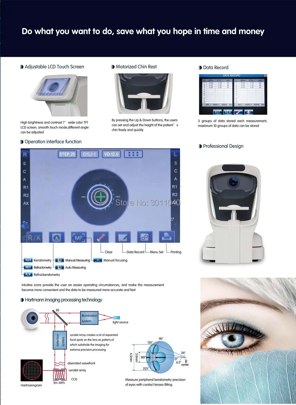 Диапазон измерения Сферическое зеркало-20 м-1 + 20 м-1(VD = 12. 0,12 М-1 или 0,25 м-1 размер шага) Цилиндрическое зеркало-8 м-1 + 8 м-1 (0,12 М-1 или 0,25 м-1 размер шага) Ось 0 ∽ 180 (1 шаг) Диапазон измерения межзрачкового расстояния 40 ∽ 85 мм (шаг 1 мм) Расстояние между вершинами 0 мм, 12 мм, 13,75 мм, 15 мм Минимальный измеримый ученик Ø2.2 мм Визуальный знак Автоматическая облачная карта Дисплей 5,7 "настоящий цвет TFT LCD Принт Термопринтер с автоматическим резаком Диапазон автоматического подъема Вверх и вниз ± 16 мм Блок питания 100-240 В, 50/60 Гц Размер 68 см ()X46 (см) X64 (см) Вес Вес нетто: 14,5 кг, вес брутто: 25 кг