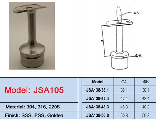 Опора для поручней из нержавеющей стали A105 используется для подключения поручней к висельному столбу. Используйте высокопрочный клей из нержавеющей стали для достижения лучших результатов. Доступный в AISI 304 ранг для внутренних применений. Подходит для круглого рельса 38,1 мм или 50,8 мм Зеркального блеска Прост в использовании Прост в установке Поднимет поручень 38,1 мм или 50,8 мм от верхней части шпателя до нижней части поручня