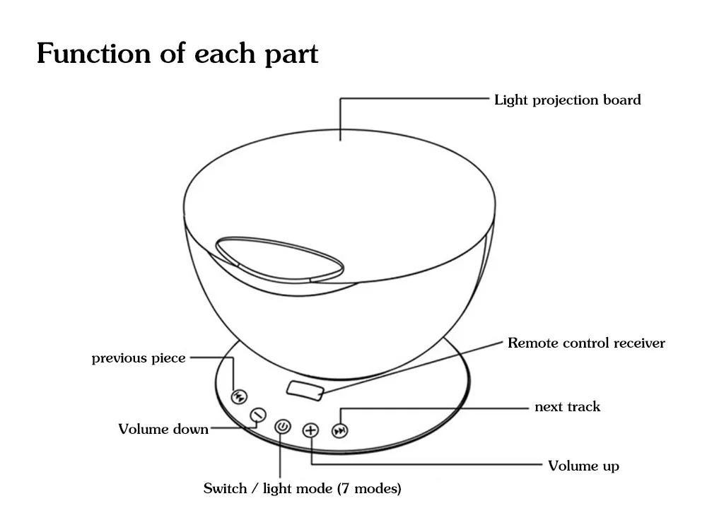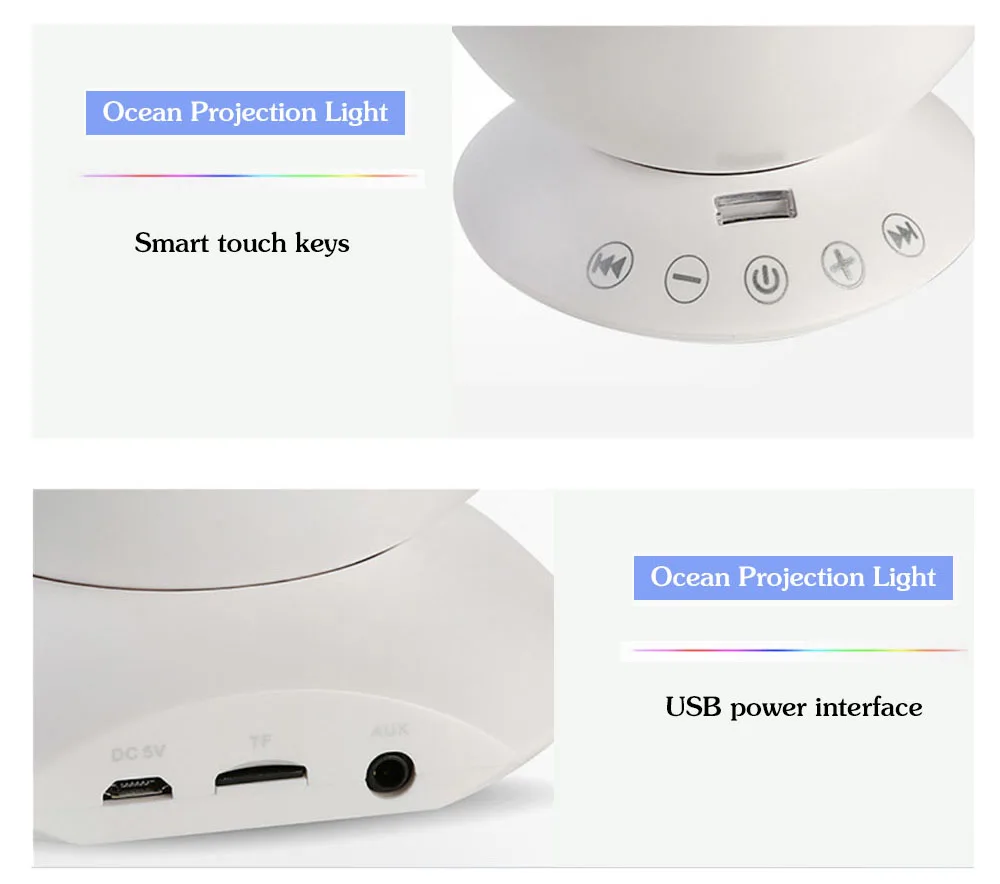 Посылка: Океан проектор * 1 Аудио кабель * 1 Кабель USB * 1 Информация о товаре: Размер продукта: 12,6*12,6*10,5 см Номинальная мощность: 2 Вт Номинальное напряжение/ток: DC5V/1A Вес нетто продукта: 300 г Вес брутто: 450 г Материал изделия: АБС-пластик USB Длина: 1,2 метров Аудио Длина кабеля: 0,6 м Посылка: Океан проектор * 1 Аудио кабель * 1 Кабель USB * 1 1. Океанский волновой проектор с пультом дистанционного управления 2. Музыкальный плеер с динамиком 3. Посылка включает в себя: Океанский проектор аудио кабель Usb кабель 4. Lastest Модернизированный пульт дистанционного Управление океан тема проектор волны светильник Модернизированный мини-проектор, который может проектировать красочные светильник s на гладкий потолок или стены для создания романтического, а также для отдыха и de светильник Фул атмосферу. Дайте ощущение лежа на пляже поздно ночью, наблюдая за волнами 5. Светильник Ocean Mood-это гипнотическая музыкальная лампа, атмосферный проектор, считываемая карта и звуковое устройство «все в одном». Встроенный 12 high-end сверхъяркий светодиодный Большой размер затрудняетесь в выборе правильного размера? Чип бусины (4 красных шариков, 4 голубых бусин, 4 зеленый бисер) учитывайте возможность наличия погрешности в Шире ООПТ, более четкая проекция и длительный срок службы, 7 режимов изменения цвета. Светильник отражается и преобразуется в романтическую атмосферу красочных волн океана 6. Проектор светильник может читать TF карту или может быть подключен к 3,5 мм аудио устройства ввода-вывода: сотовом телефоне, ПК, ноутбуков и MP3. Он прост в использовании и доступен для использования в любое время. Океанский тематический проектор, встроенный динамик высокой мощности. Аудиосистема оснащена базой, чтобы обеспечить более сенсационный акустический эффект 7. Умный сенсорный ключ: клавиша питания-переключатель включения/выключения и клавиша переключения режимов на светильник. Нажмите и удерживайте клавишу в течение 3 секунд, чтобы начать. Коснитесь его, чтобы выбрать один из семи режимов светильник. Нажмите и удерживайте клавишу в течение 3 секунд для выключения. Кнопки + и кнопки регулировки громкости. Проектор имеет встроенную гипнотическую музыку. При низком уровне громкости после запуска пользователи могут нажать кнопку +, чтобы переключиться на следующую песню. Эта функция доступна только при вставке tf-карты 8. Регулируемый угол дисплея: 45 градусов наклона, позволяет проектировать светильник прямо вверх или точка в другом направлении в соответствии с вашими потребностями. Идеально подходит для любых для праздников и вечеринок украшения для того, чтобы создать приятный и расслабляющий опыт сна для детей, успокоите и комфорта детей для сна
