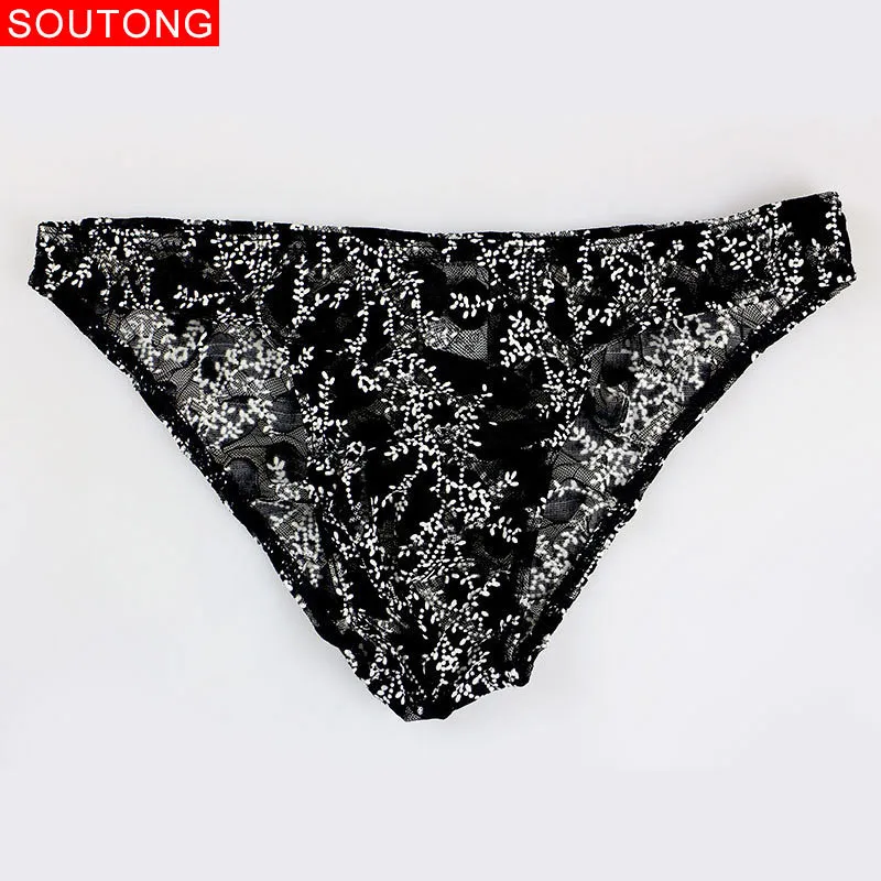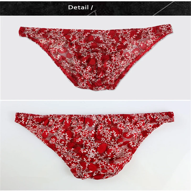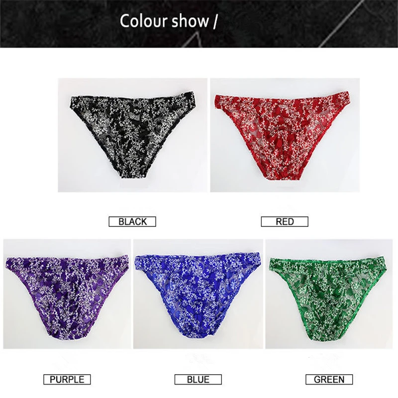 Сексуальные мужские кружевные трусы бикини, нижнее белье, трусы для пениса, трусики с кружевными цветочными полосками, кружевные черные, красные, зеленые