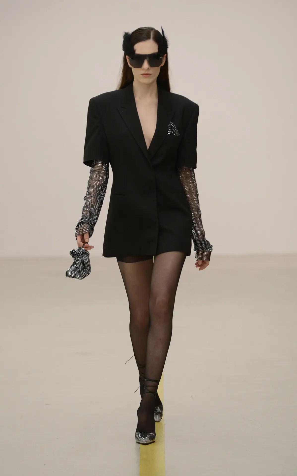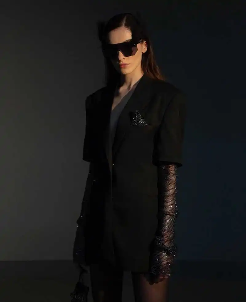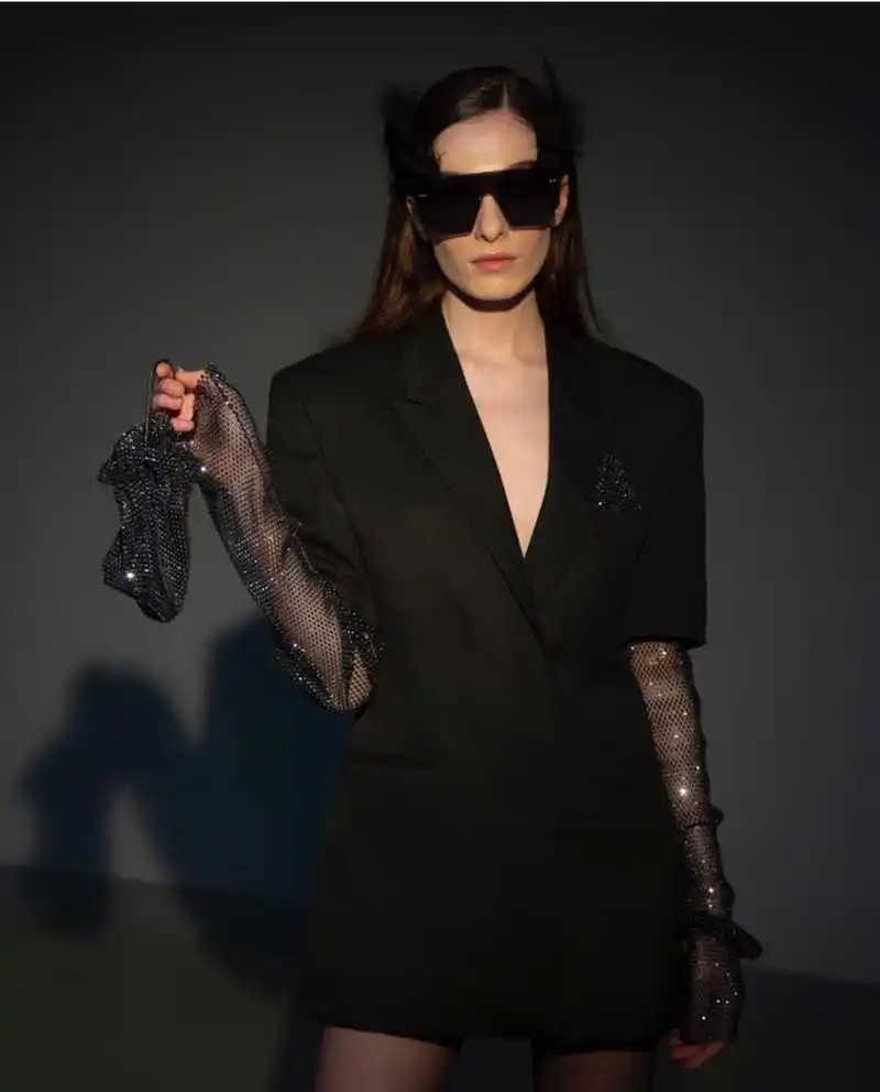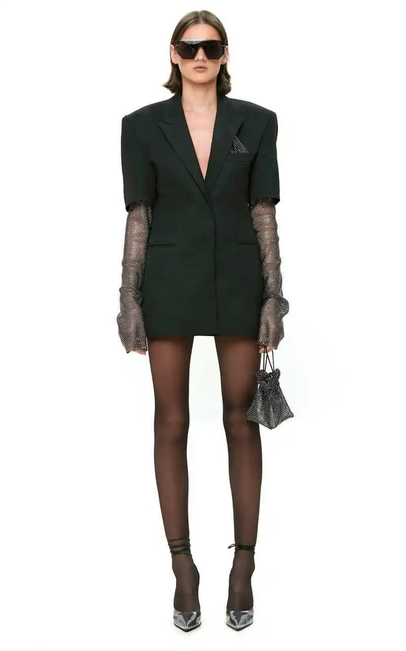 L длина: 69, ширина плеч: 46, обхват груди: 106, длина рукава: 28-68 1. Сексуальный дизайн с v-образным вырезом и отложным воротником; 2. Тонкий длинный крой; 3. Лоскутные блестящие стразы на рукавах; 4. Высококачественная ткань и пошив.