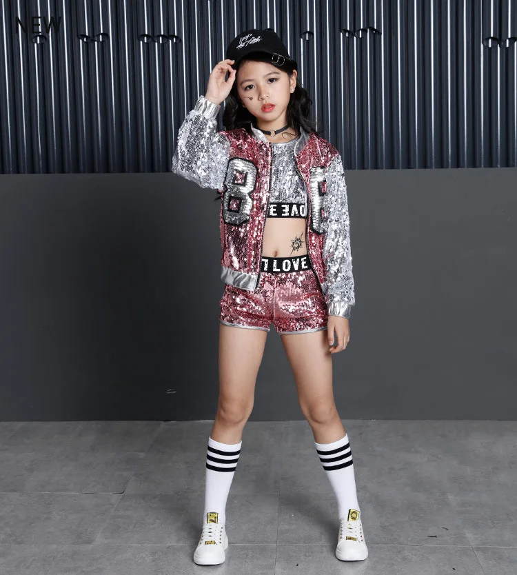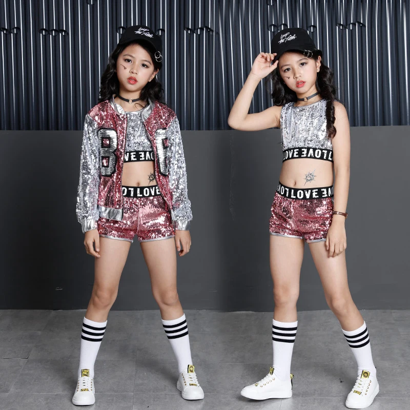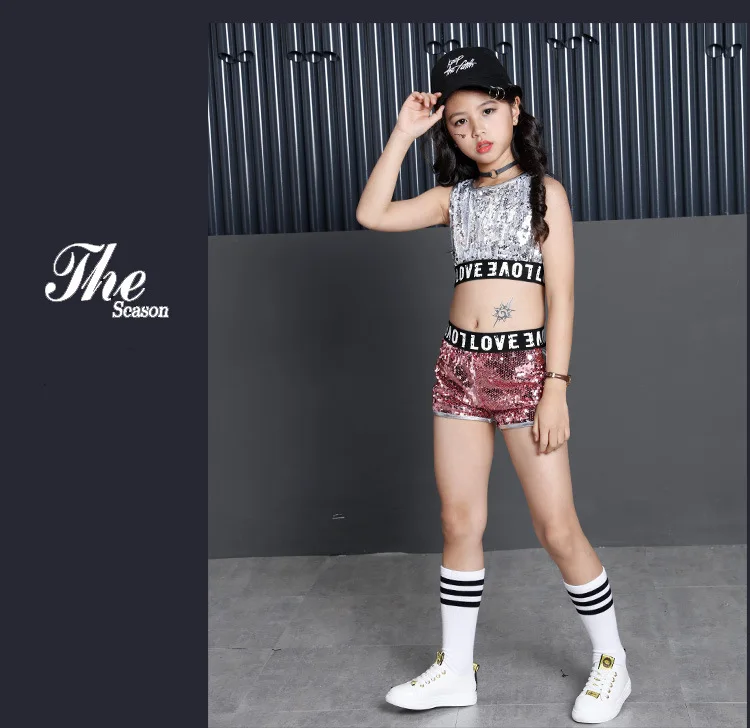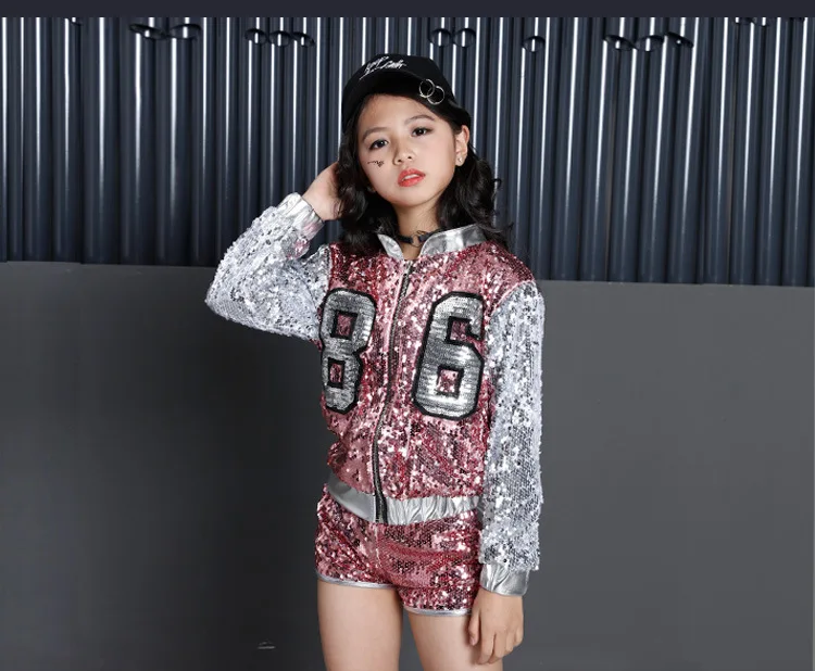 Новый детский Джазовый современный танцевальный костюм детская одежда в стиле хип-хоп Уличная одежда с блестками, куртка в стиле хип-хоп, футболка джазовые платья для девочек