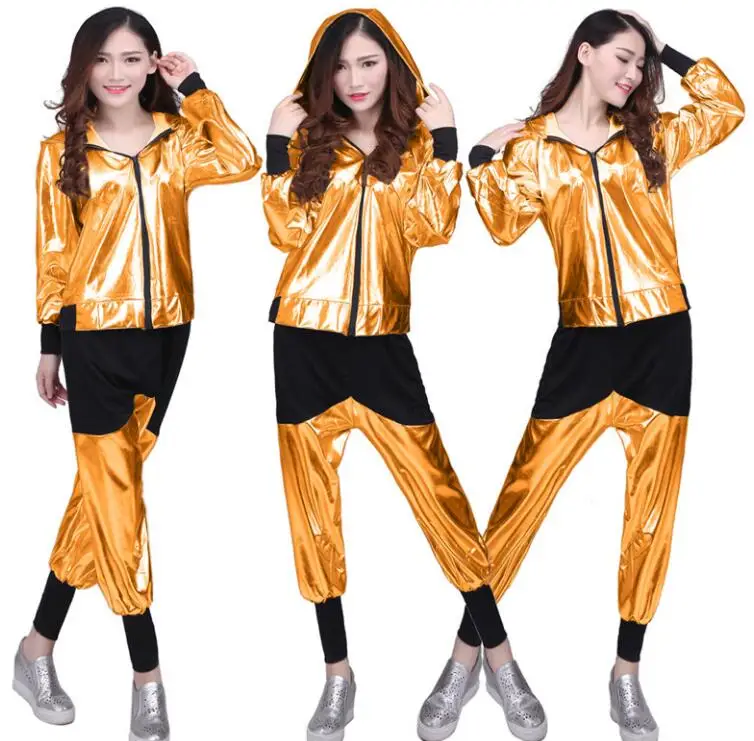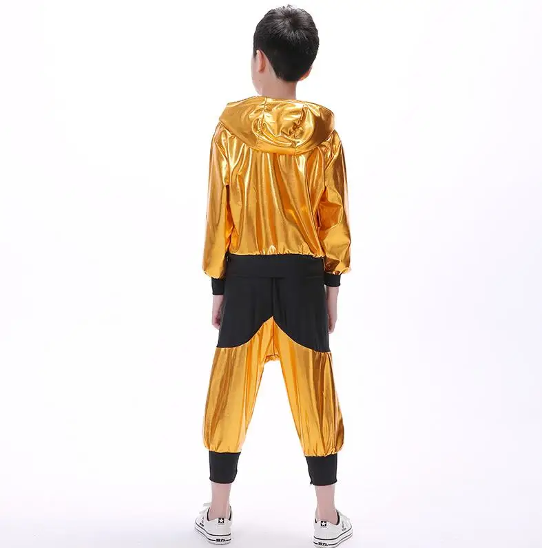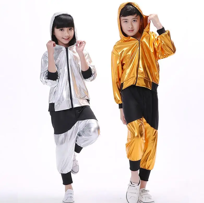 Танцевальные костюмы в стиле хип-хоп для мальчиков и девочек; цвет золотистый, Серебристый; куртка с длинными рукавами; пальто; брюки; костюм для уличных танцев; костюм для сцены
